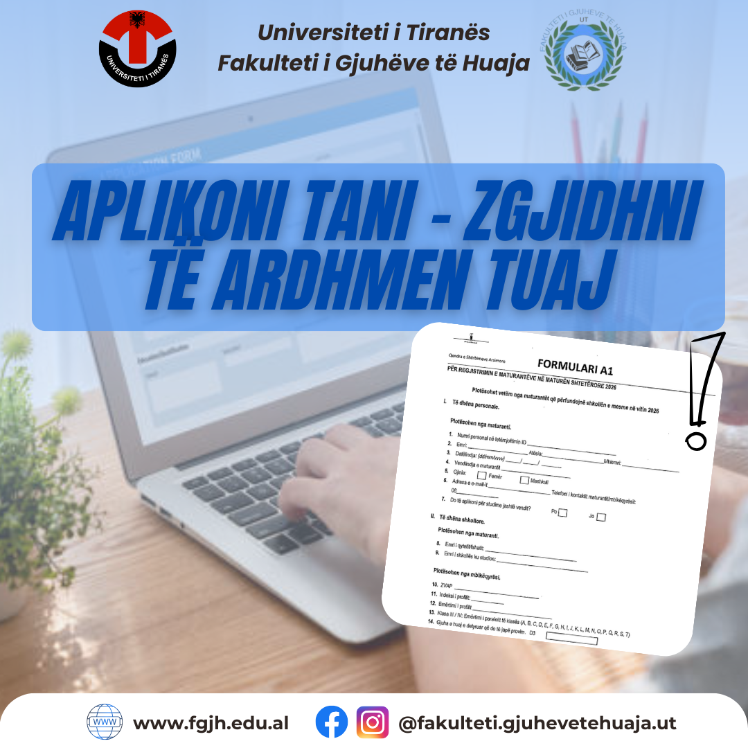📌 Procesi i aplikimit për formularin A1 vijon Fakulteti i Gjuhëve të Huaja, UT, rikujton maturantët se aplikimi për formularin A1 është i hapur dhe përbën një hap të rëndësishëm drejt përzgjedhjes së programit të studimit në arsimin e lartë.