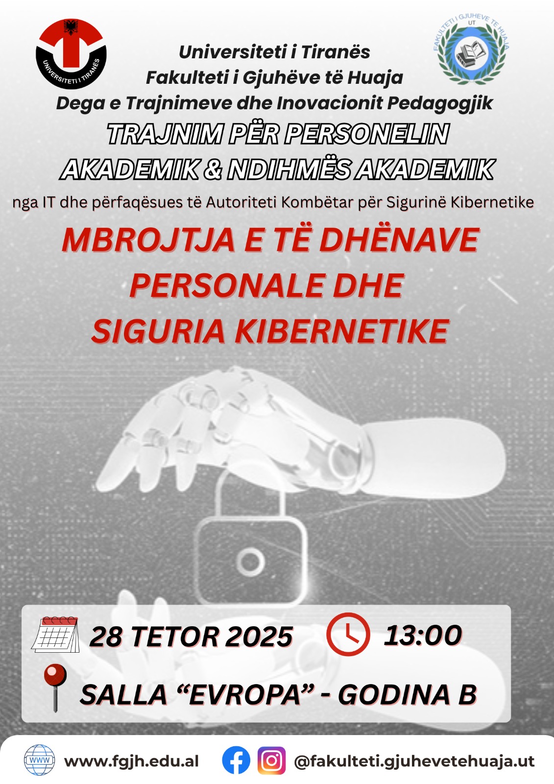 Në kuadër të zhvillimit të vazhdueshëm të personelit akademik dhe ndihmës akademik, Dega e Trajnimeve dhe Inovacionit Pedagogjik, në bashkëpunim me Zyrën e Teknologjisë së Informacionit, ju fton të merrni pjesë në trajnimin me temë: “Mbrojtja e të dhënave personale dhe siguria kibernetike” me përfaqësues nga Autoriteti Kombëtar për Sigurinë Kibernetike.  📅 Data: 28 tetor 2025  🕚 Ora: 13:00  📍 Vendi: Salla”Evropa”, kati i parë, Godina B, Fakulteti i Gjuhëve të Huaja.  🔗 Trajnimin mund ta ndiqni edhe online në platformën Google Meet nëpërmjet link-ut: https://meet.google.com/pes-ejgv-dow