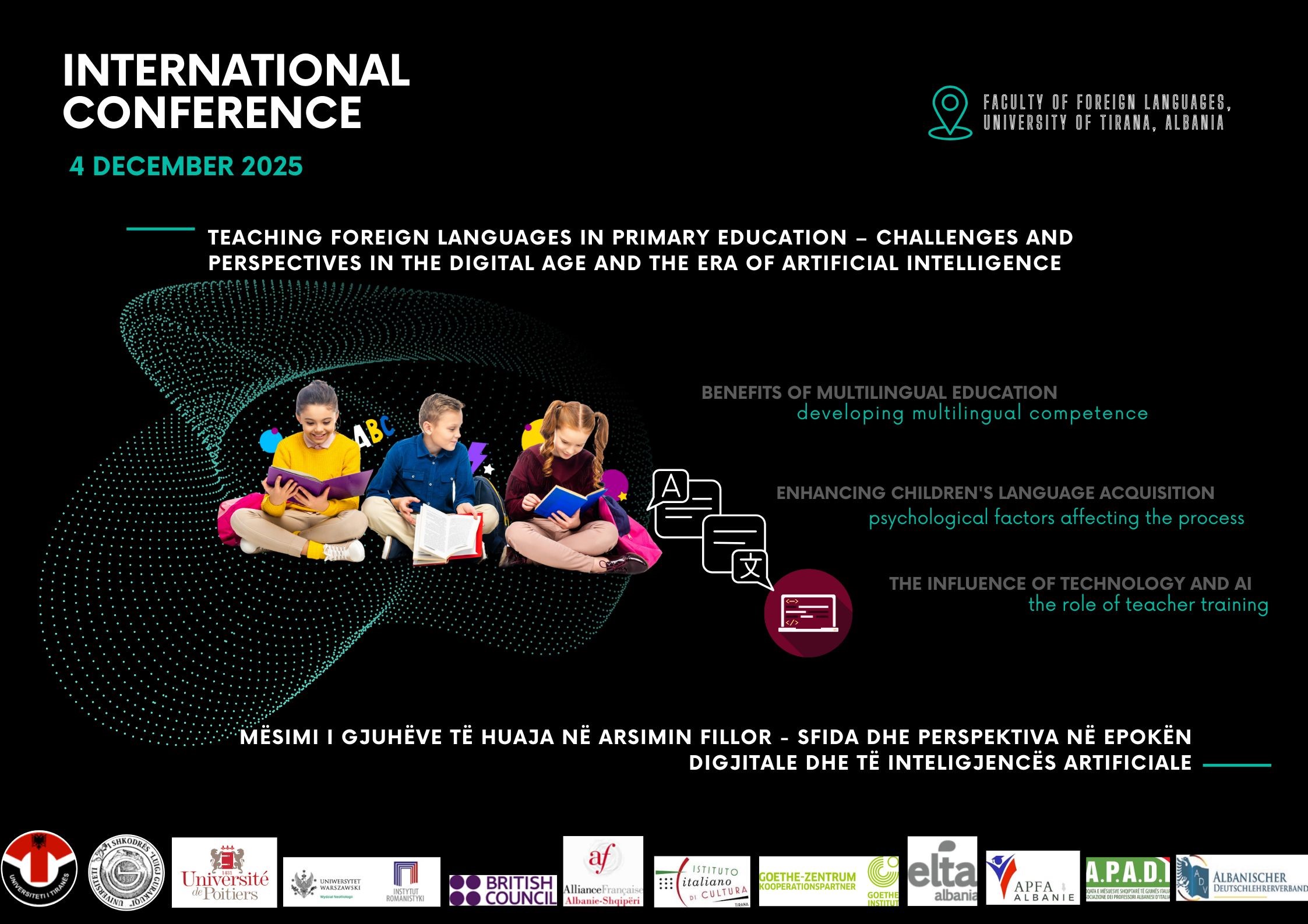 Fakulteti i Gjuhëve të Huaja, Universiteti i Tiranës, ka kënaqësinë t’ju ftojë në Konferencën shkencore ndërkombëtare “Mësimdhënia e Gjuhëve të Huaja në Arsimin Fillor – Sfidat dhe Perspektivat në Epokën Digjitale dhe të Inteligjencës Artificiale”, në datën 4 dhjetor 2025, ora 09:30 am, Salla e konferencave Evropa, FGJH. Konferenca organizohet në bashkëpunim me institucione arsimore...