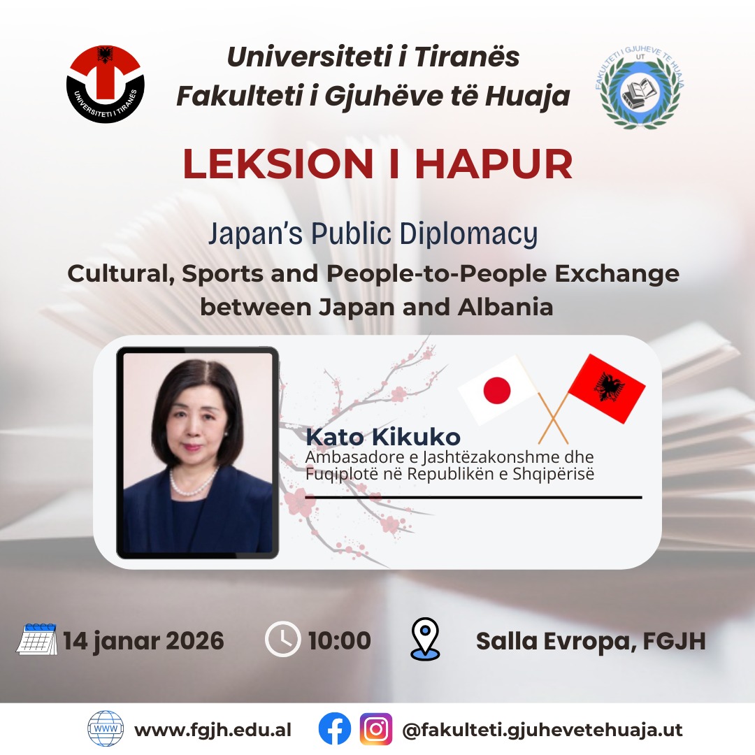 Fakulteti i Gjuhëve të Huaja ka kënaqësinë të mirëpresë Ambasadoren e Japonisë në Shqipëri, Znj. Kato Kikuko, në një leksion të hapur me temë: “Japan’s Public Diplomacy: Cultural, Sports, and People-to-People Exchange between Japan and Albania” Gjatë këtij leksioni, Ambasadorja Kato do të ndajë me studentët dhe personelin akademik perspektiva mbi diplomacinë japoneze dhe rolin...