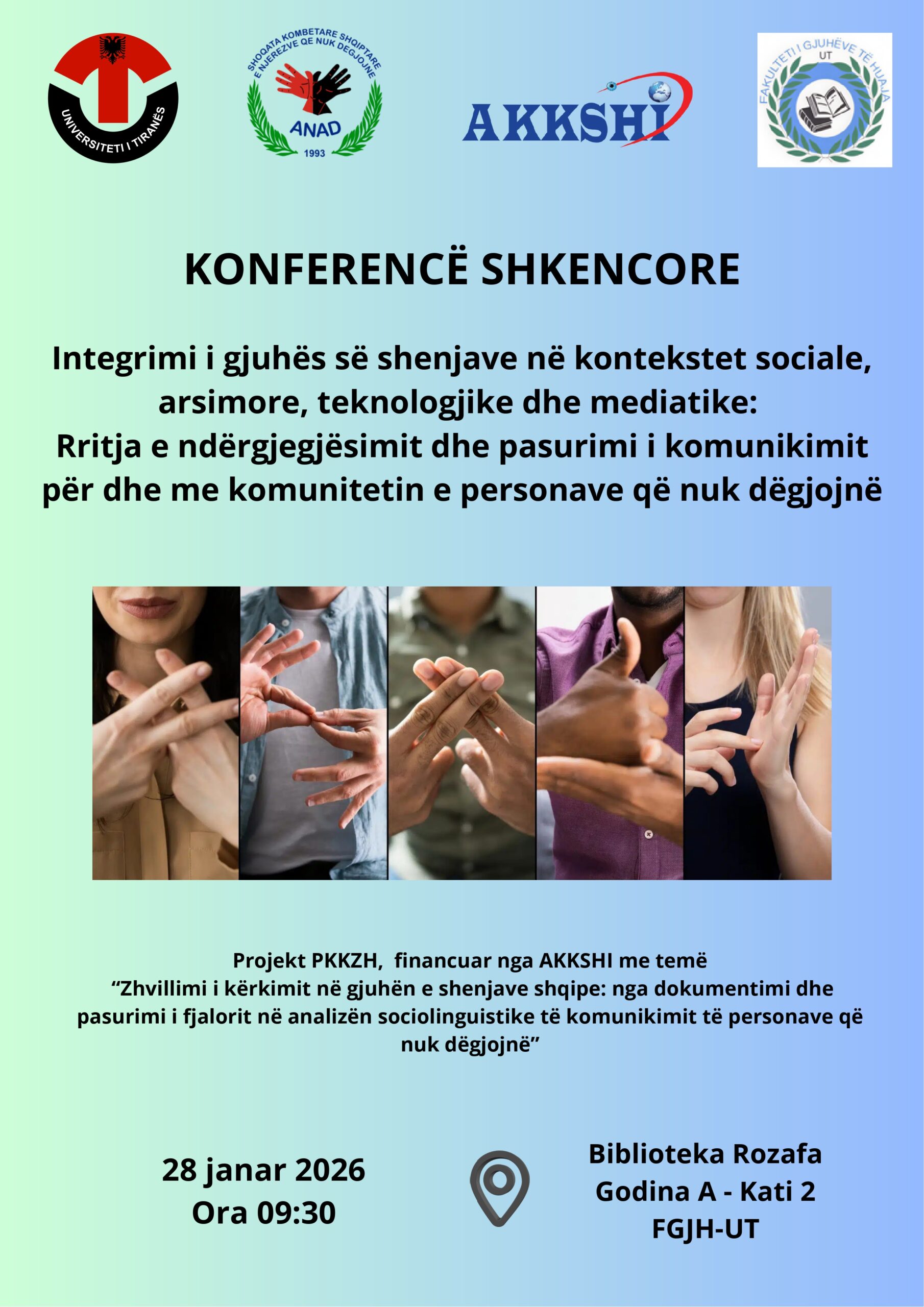 Kjo konferencë, e para e këtij lloji në Shqipëri, synon rritjen e ndërgjegjësimit dhe pasurimin e komunikimit për dhe me komunitetin e personave që nuk dëgjojnë, duke sjellë në vëmendje kërkimin shkencor dhe praktikat bashkëkohore të arsimimit në fushën e gjuhës së shenjave. Konferenca zhvillohet në kuadër të projektit PKKZH, të financuar nga AKKSHI. Ju...