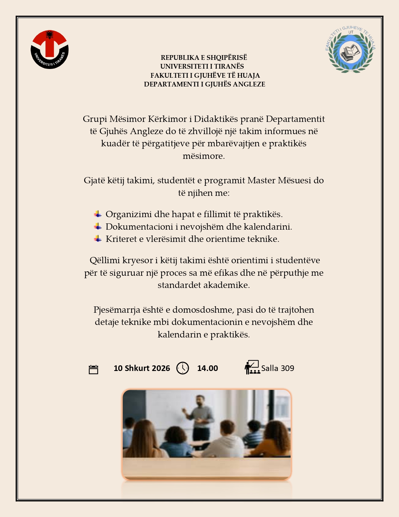 Grupi Mësimor-Kërkimor i Didaktikës, pranë Departamentit të Gjuhës Angleze, Fakulteti i Gjuhëve të Huaja, UT, njofton të gjithë studentët e ciklit Master “Mësuesi” se, në kuadër të përgatitjeve për mbarëvajtjen e praktikës mësimore, do të zhvillohet një takim informues më 10.02.2026, ora 14:00, në sallën 309. 🎓📘 Gjatë këtij takimi, studentët do të njihen me...
