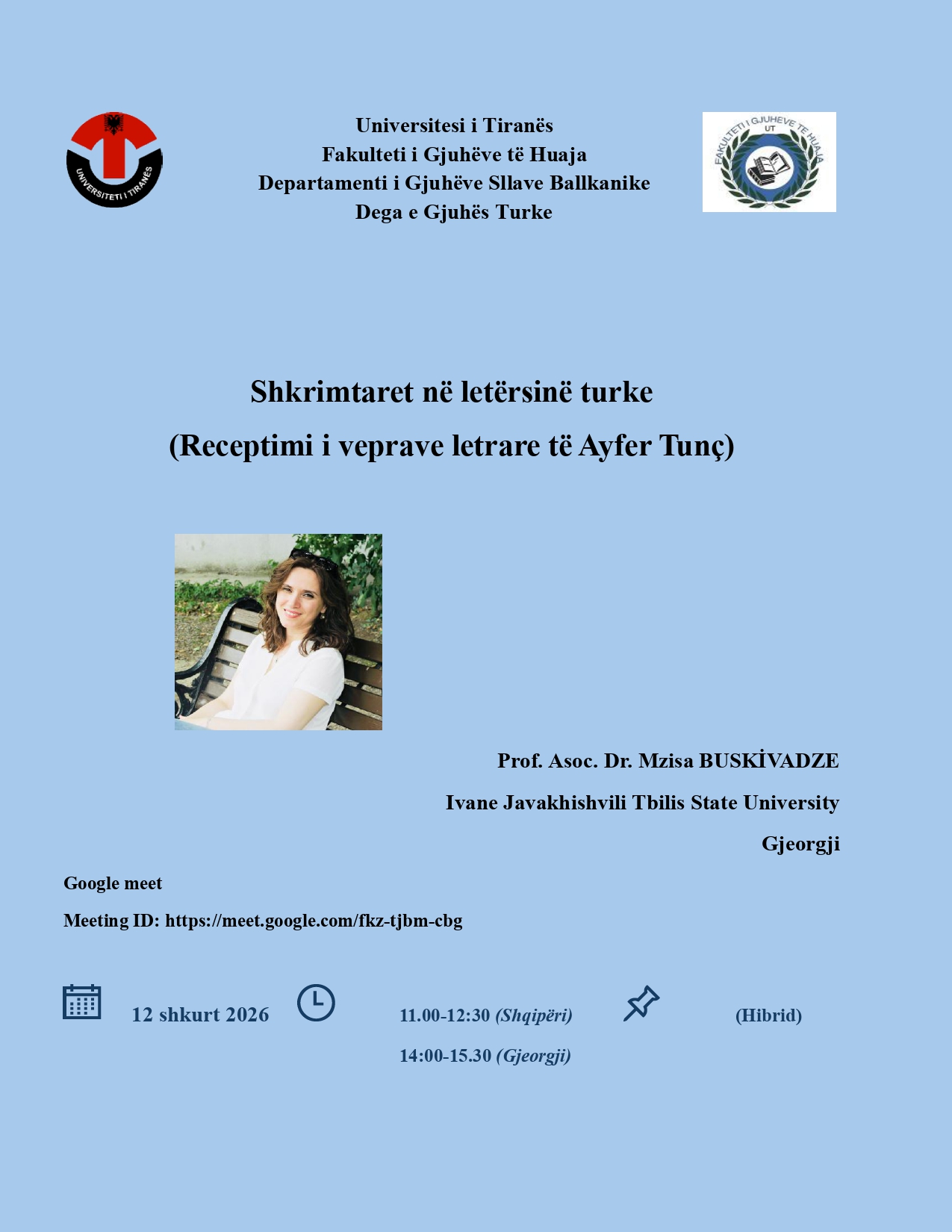 Më 12.02.2026 Grupi Mësimor-Kërkimor i Degës së Gjuhës Turke pranë Departamentit të Gjuhëve Sllave e Ballkanike, organizoi aktivitetin me temë “Shkrimtaret në letërsinë turke – Receptimi i veprave letrare të shkrimtares Ayfer Tunç” 📚✨, me të ftuar Prof. Asoc. Dr. Mzisa BUSKİVADZE nga Universiteti shtetëror “Ivane Jakakhishvili Tbilis State University” në Gjeorgji dhe me pjesëmarrjen...