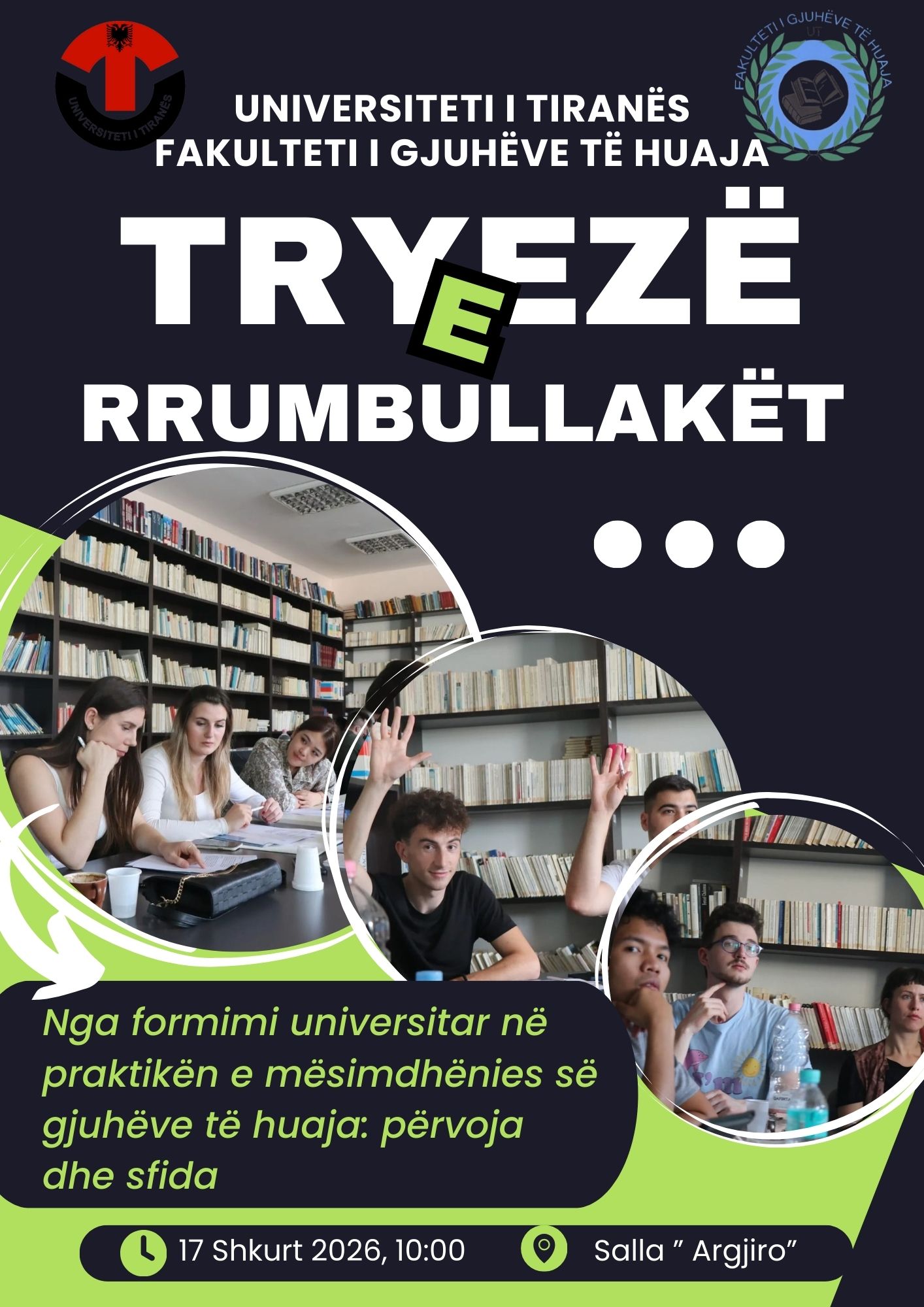 Fakulteti i Gjuhëve të Huaja, Universiteti i Tiranës, organizon më 17 shkurt 2026, ora 10:00 – 12:00, në Sallën “Argjiro”, tryezën e rrumbullakët me temë: “Nga formimi universitar në praktikën e mësimdhënies së gjuhëve të huaja: përvoja dhe sfida”. Qëllimi i këtij aktiviteti është krijimi i një hapësire reflektimi dhe bashkëpunimi ndërmjet aktorëve kryesorë të...