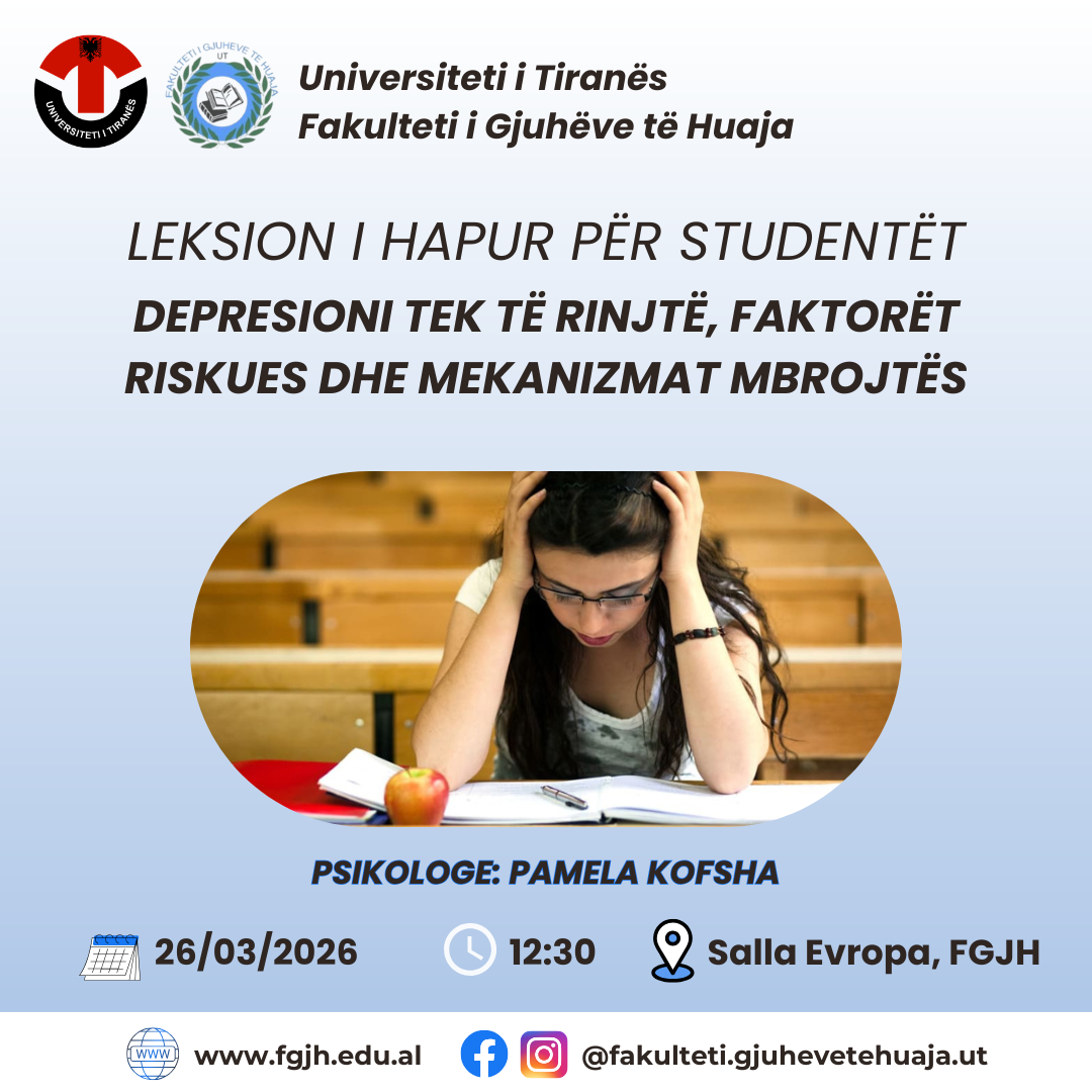 Të dashur studentë, Ju njoftojmë se më 26.03.2026, ora 12:30, Salla Evropa, do të zhvillohet leksioni i hapur me temë: “Depresioni tek të rinjtë: faktorët riskues dhe mekanizmat mbrojtës.” Gjatë këtij leksioni do të trajtohen aspektet kryesore që lidhen me shëndetin mendor të të rinjve, duke u ndalur tek faktorët që ndikojnë në shfaqjen e...