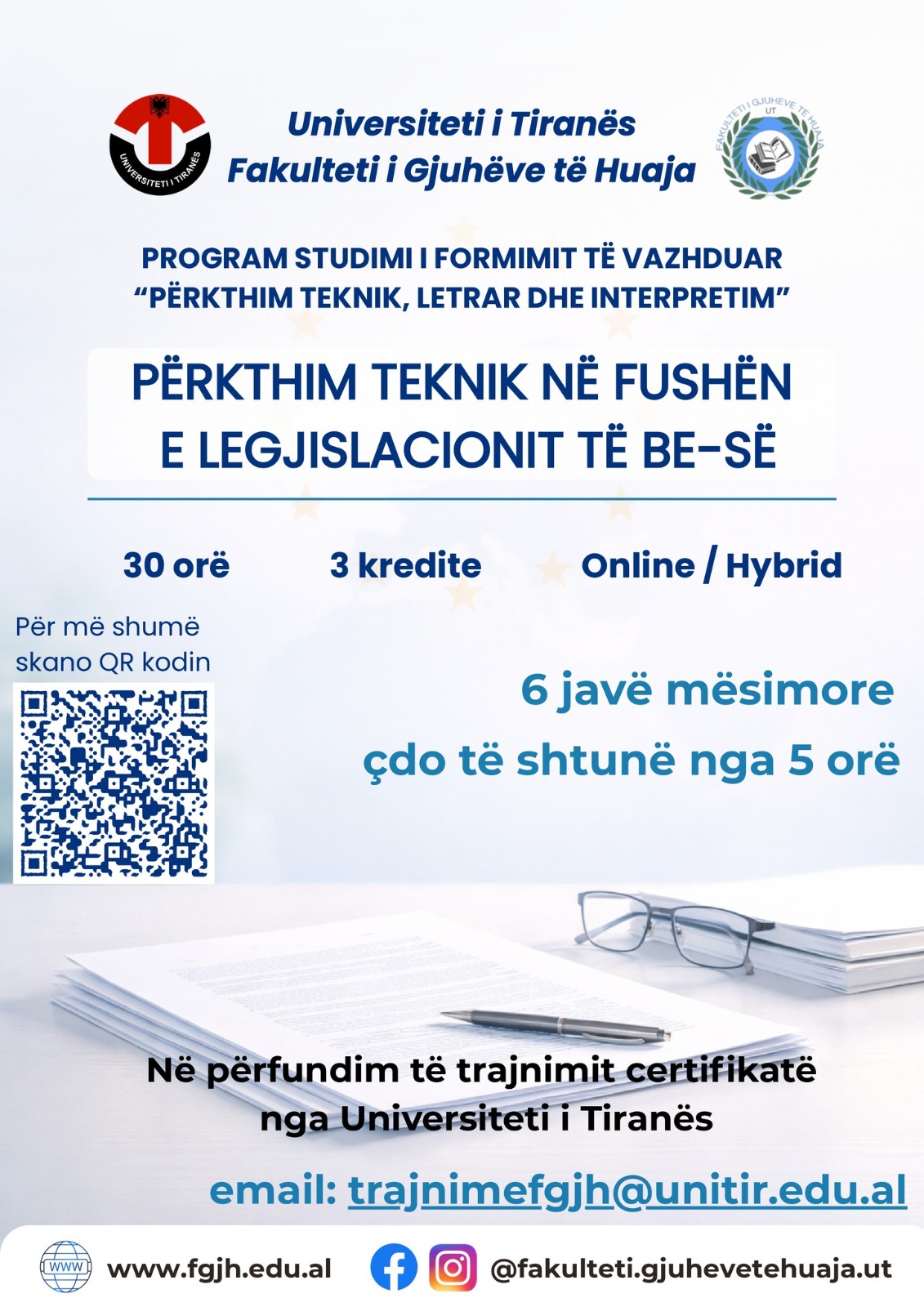 Fakulteti i Gjuhëve të Huaja i Universitetit të Tiranës, hap aplikimet për modulin e formimit të vazhduar në Fushën e Përkthimit Teknik, Letrar dhe Interpretim: 🔹 Përkthim teknik në fushën e legjislacionit të BE-së 🗓 Aplikimet: 1 – 15 Prill 2026 📢Njoftimi mbi modalitetet e fillimit të trajnimit: 25 Prill 2026 📚 Kohëzgjatja: 30 orë...