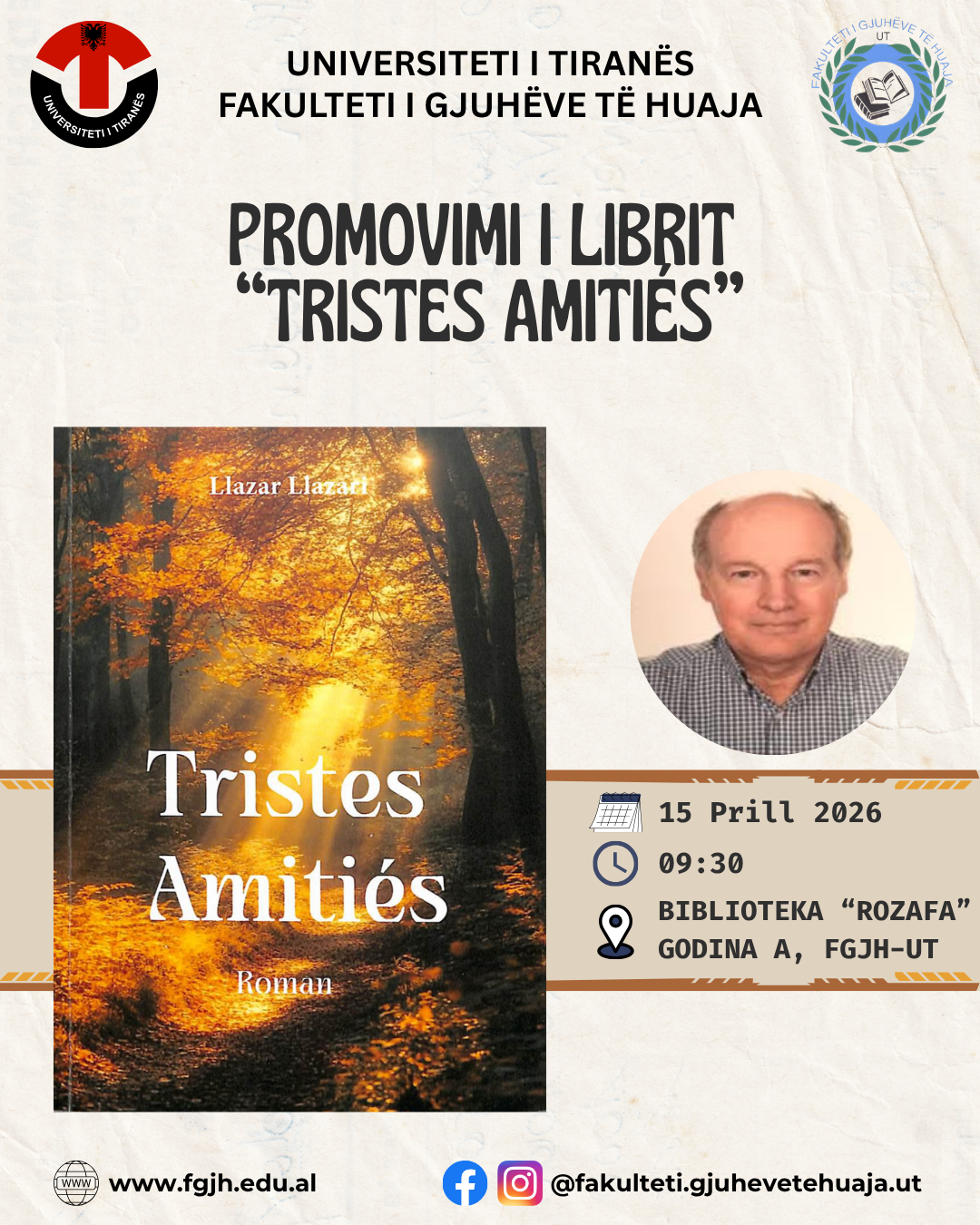 Fakulteti i Gjuhëve të Huaja, UT organizon promovimin e librit “Tristes Amitiés”, shkruar nga Llazar Llazari dhe i përkthyer nga gjuha shqipe në gjuhën frënge nga Prof. Dr. Raul Lilo, pedagog pranë Departamentit të Gjuhës Frënge, FGJH-UT. 🗓️ Data: 15 Prill 2026 🕘 Ora: 09:30 📍 Vendi: Biblioteka “Rozafa”, Godina A, FGJH-UT Një mundësi e...