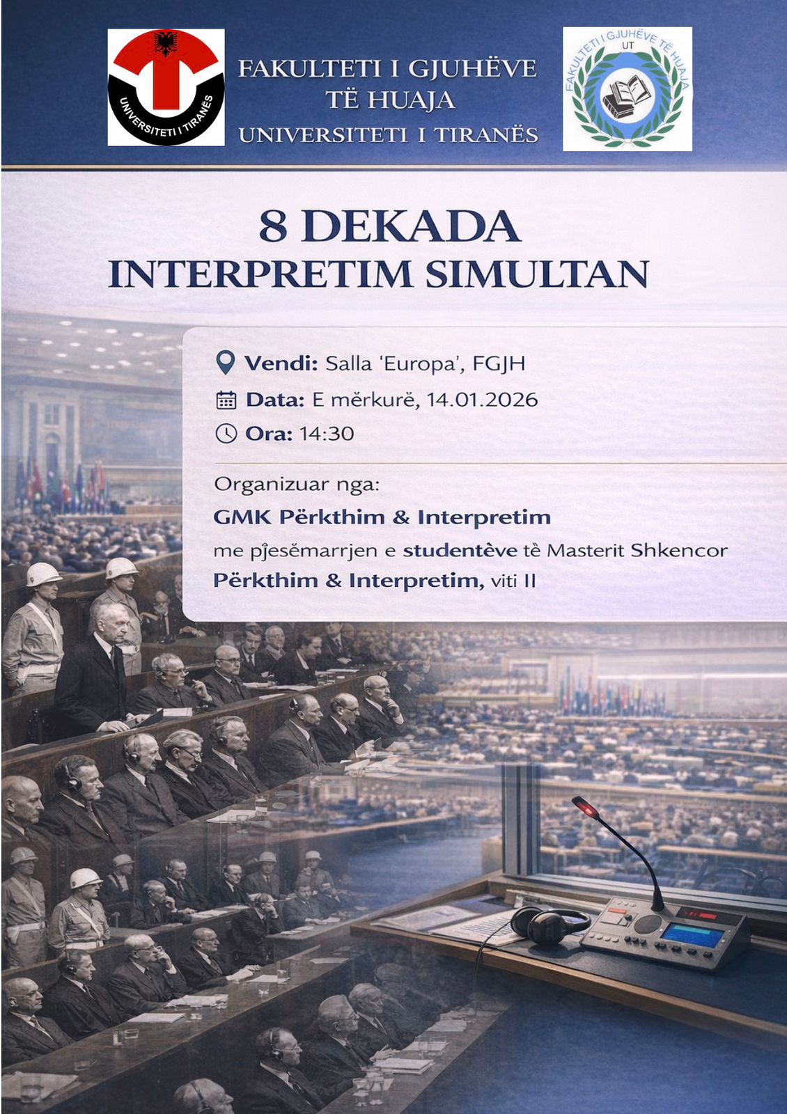 Me rastin e 80-vjetorit të Gjyqeve të Nurembergut dhe lindjes së Interpretimit Simultan, GMK-ja Përkthim-Interpretim organizon së bashku me studentët e Masterit Shkencor Përkthim Teknik-Letrar dhe Interpretim, aktivitetin: “8 Dekada Interpretim Simultan”, nesër 14.01.26 ora 14.30, Salla ‘Europa’.