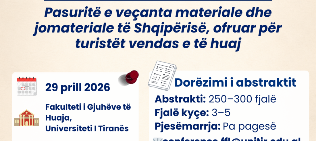 Fakulteti i Gjuhëve të Huaja, Universiteti i Tiranës, në bashkëpunim me partnerët institucionalë, organizon konferencën shkencore ndërkombëtare: “Pasuritë e veçanta materiale dhe jomateriale të Shqipërisë, ofruar për turistët vendas e të huaj” 📅 29 prill 2026 📍 Fakulteti i Gjuhëve të Huaja, Universiteti i Tiranës...Lexo më shumë