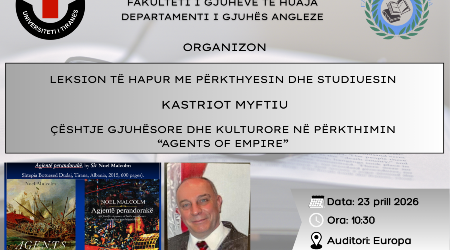 Grupi mësimor-kërkimor “Përkthim – Interpretim” pranë Departamentit të Gjuhës Angleze, FGJH-UT, ju fton në një seancë informimi mbi programet e studimit në nivel Master për vitin akademik 2026–2027. 📅 Data: E enjte, 23.04.2026 🕒 Ora: 12:30 📍 Vendi: Auditori 207 Gjatë këtij takimi do të njiheni me përmbajtjen dhe kërkesat specifike të programeve: 🎓 Master i Shkencave në Përkthim dhe Interpretim 🎓 Master Profesional Ky është një moment i mirë...Lexo më shumë