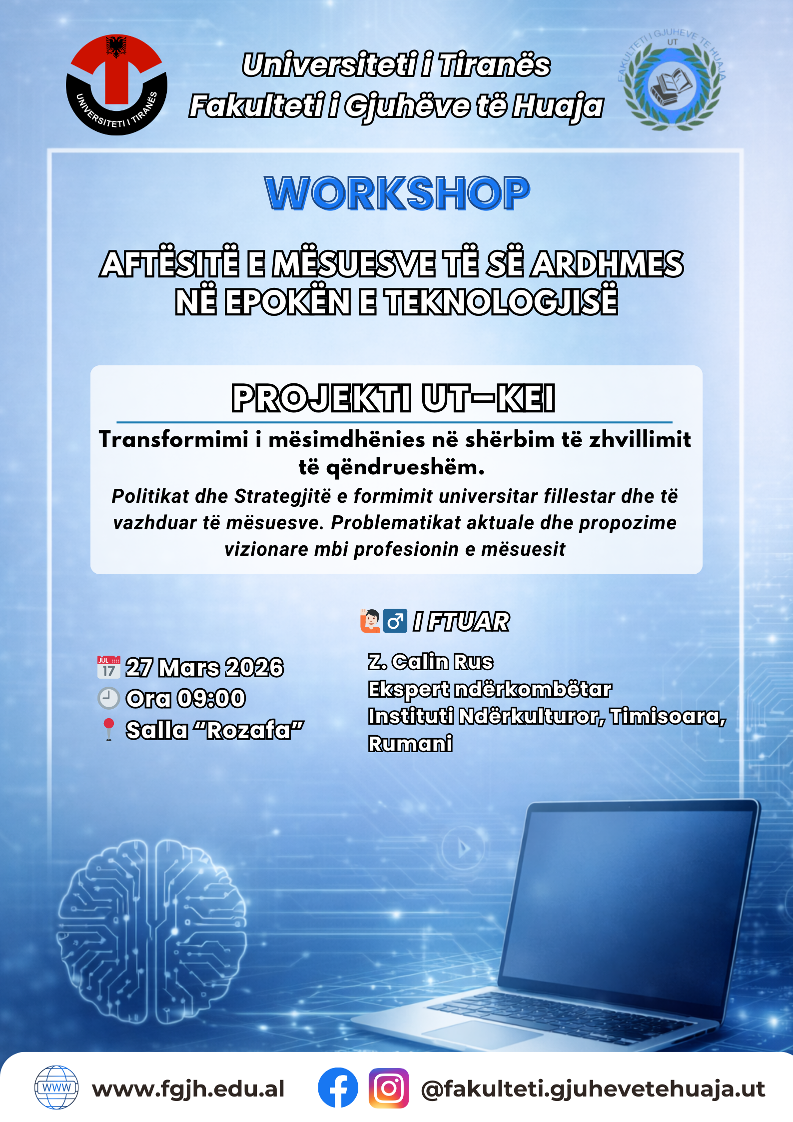 Në kuadër të projektit UT-KEI “Transformimi i mësimdhënies në shërbim të zhvillimit të qëndrueshëm: Politikat dhe strategjitë e formimit universitar fillestar dhe të vazhduar të mësuesve. Problematikat aktuale dhe propozime vizionare mbi profesionin e mësuesit”, do të organizohet një workshop në datën 27 mars 2026, në orën 09:00, në Sallën Rozafa. Ky aktivitet zhvillohet si pjesë...Lexo më shumë