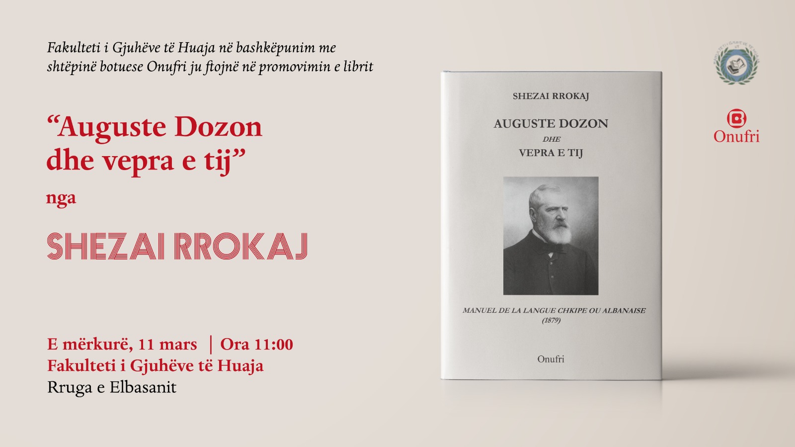 Fakulteti i Gjuhëve të Huaja, Universiteti i Tiranës (FGJH-UT), në bashkëpunim me shtëpinë botuese Onufri, ju ftojnë në promovimin e librit “August Dozon dhe vepra e tij” me autor Prof. Dr. Shezai Rrokaj. 📅 11 mars 2026 🕚 Ora 11:00 📍 Salla “Rozafa”, Fakulteti i Gjuhëve të Huaja, UT Ky aktivitet do të sjellë në vëmendje...Lexo më shumë