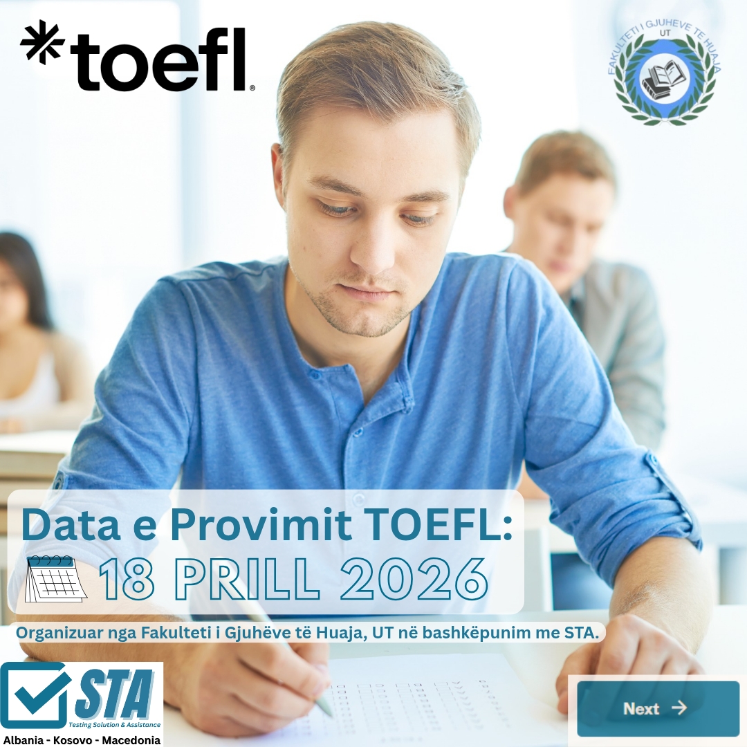 TOEFL ITP në Fakultetin e Gjuhëve të Huaja! Fakulteti i Gjuhëve të Huaja, në bashkëpunim me STA, organizon testin ndërkombëtar të gjuhës angleze TOEFL ITP – një certifikim i vlefshëm për: Aplikime akademike Bursa & mobilitete studentore Vlerësim gjuhësor personal Linku për t’u regjistruar: https://registration.sta-edu.com Data e provimit: 18 Prill 2026 Ora: 10:00 Vendndodhja: Salla Europa,...Lexo më shumë