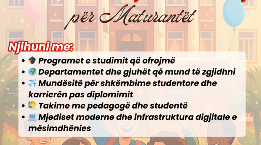 Më 26.03.2026, në Sallën “Evropa”, u zhvillua leksioni i hapur me temë: “Depresioni tek të rinjtë: faktorët riskues dhe mekanizmat mbrojtës”. Ky aktivitet u fokusua në rëndësinë e shëndetit mendor tek të rinjtë, duke analizuar faktorët të cilët rrisin rrezikun për depresion, si dhe strategjitë që ndihmojnë në ndërtimin e qëndrueshmërisë emocionale. Një vëmendje e veçantë iu kushtua mekanizmave mbrojtës, duke theksuar rolin e mbështetjes sociale, komunikimit të hapur, ndërgjegjësimit...Lexo më shumë