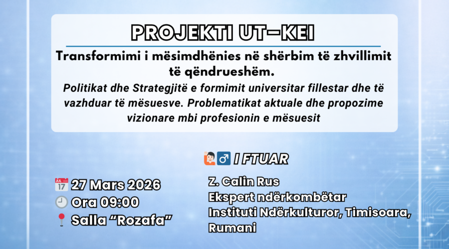 Fakulteti i Gjuhëve të Huaja, Universiteti i Tiranës, organizon më 17 shkurt 2026, ora 10:00 – 12:00, në Sallën “Argjiro”, tryezën e rrumbullakët me temë: “Nga formimi universitar në praktikën e mësimdhënies së gjuhëve të huaja: përvoja dhe sfida”. Qëllimi i këtij aktiviteti është krijimi i një hapësire reflektimi dhe bashkëpunimi ndërmjet aktorëve kryesorë të përfshirë në formimin fillestar dhe të vazhduar të mësuesve të gjuhëve të huaja. Diskutimi do...Lexo më shumë