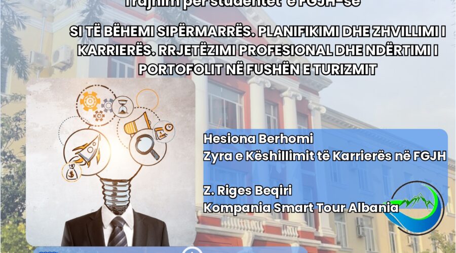 Dega e Trajnimeve dhe Inovacionit Pedagogjik, në bashkëpunim me Zyrën e Këshillimit të Karrierës në FGJH zhvilluan sot trajnimin për studentët e FGJH-së me temë: “Si të bëhemi sipërmarrës. Planifikimi dhe zhvillimi i karrierës. Rrjetëzimi profesional dhe ndërtimi i portofolit në fushën e turizmit” me të ftuar Z. Riges Beqiri nga Kompania Smart Tour Albania. Ky trajnim kishte si qëllim të pajiste studentët me njohuri praktike dhe aftësi thelbësore për...
