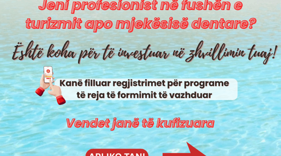 Dëshironi të zhvilloni dhe përmirësoni aftësitë tuaja profesionale pa pasur nevojë për angazhime të gjata kohore dhe financiare? Programet tona të formimit të vazhduar janë mundësia juaj për të fituar aftësitë që çdo punëdhënës kërkon dhe çdo profesionist ka nevojë. Çfarë do të përfitoni: Përmirësim të aftësive specifike; Kosto të ulët; Fleksibilitet; Karrierë dhe mundësi të reja punësimi; Rritje të mundësive profesionale në tregun e punës etj. Mos e humbisni këtë mundësi të shkëlqyer! Nxitoni të rezervoni vendin tuaj! Linku për regjistrim: https://forms.office.com/e/hrHZT3pAww Për më shumë informacion na kontaktoni në adresën: [email protected]Lexo më shumë
