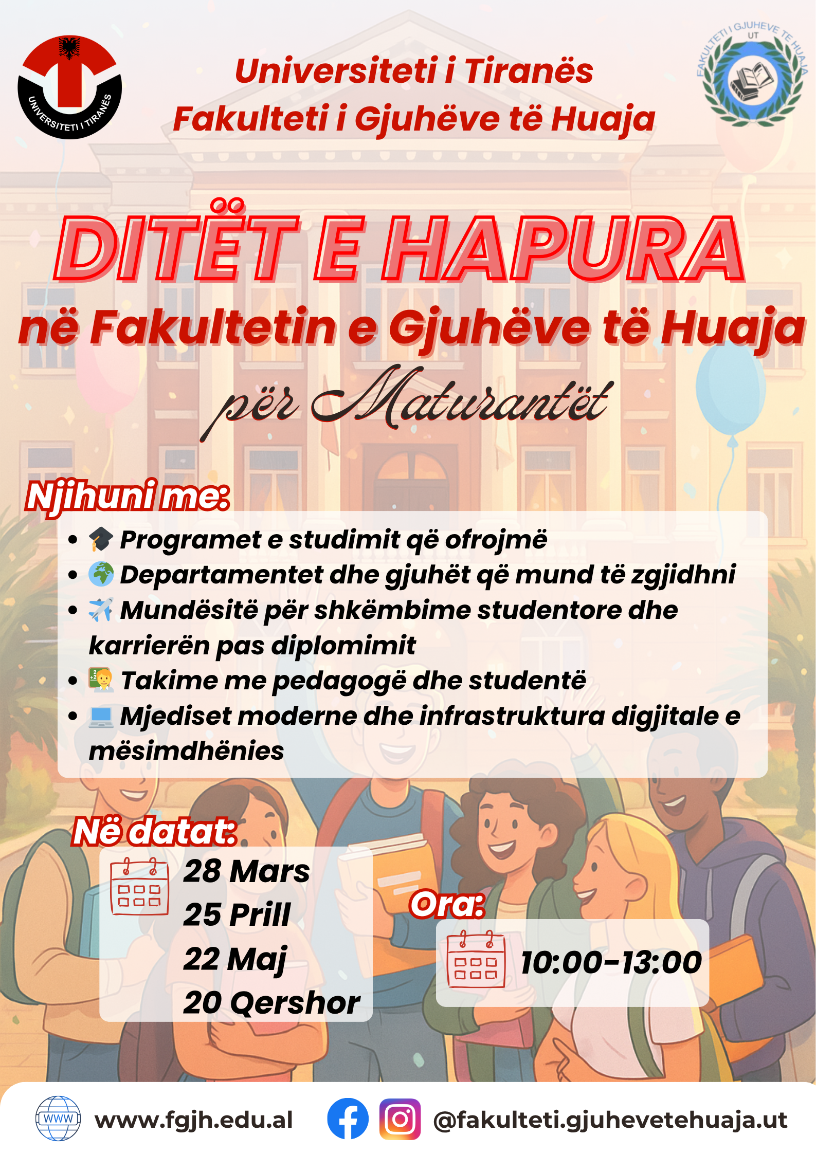 Je maturant dhe po mendon për hapin tënd të radhës? Fakulteti i Gjuhëve të Huaja, Universiteti i Tiranës, të fton më 28 mars për një ditë të hapur kushtuar zgjedhjes akademike! Gjatë kësaj dite do të kesh mundësinë të: ✅ Njihesh nga afër me programet e studimit 🌍 Zbulosh mundësitë për bursa dhe për shkëmbime studentore...Lexo më shumë