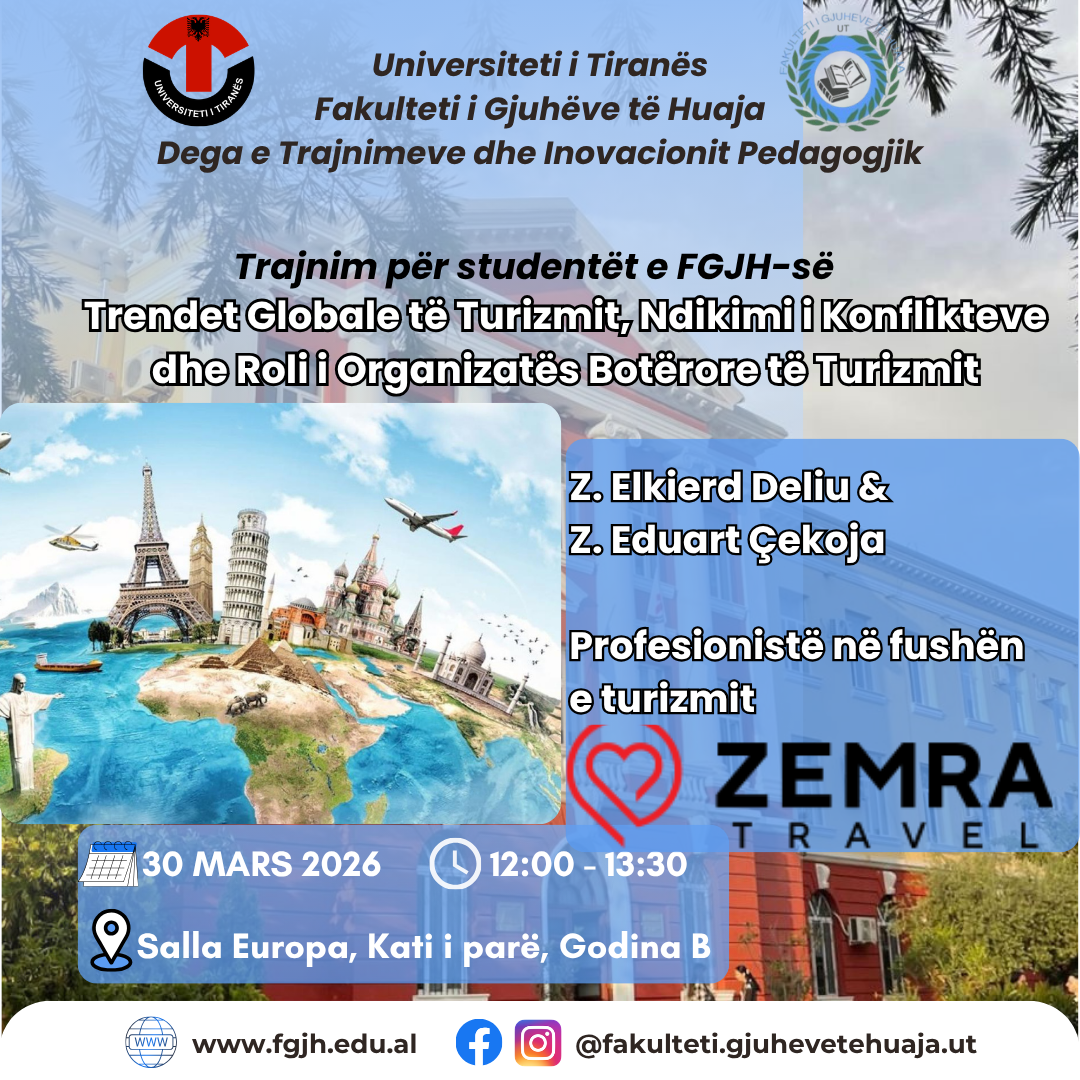 Në kuadër të zhvillimit të vazhdueshëm të studentëve tanë, Dega e Trajnimeve dhe Inovacionit Pedagogjik, në bashkëpunim me Agjencinë Zemra Travel, organizon trajnimin me temë: “Trendet Globale të Turizmit, Ndikimi i Konflikteve dhe Roli i Organizatës Botërore të Turizmit” 📆Data: 30 mars 2026 ⏱️Ora: 12:00 – 13:30 📍Vendi: Salla “Europa”, Godina B, Fakulteti i Gjuhëve të...Lexo më shumë