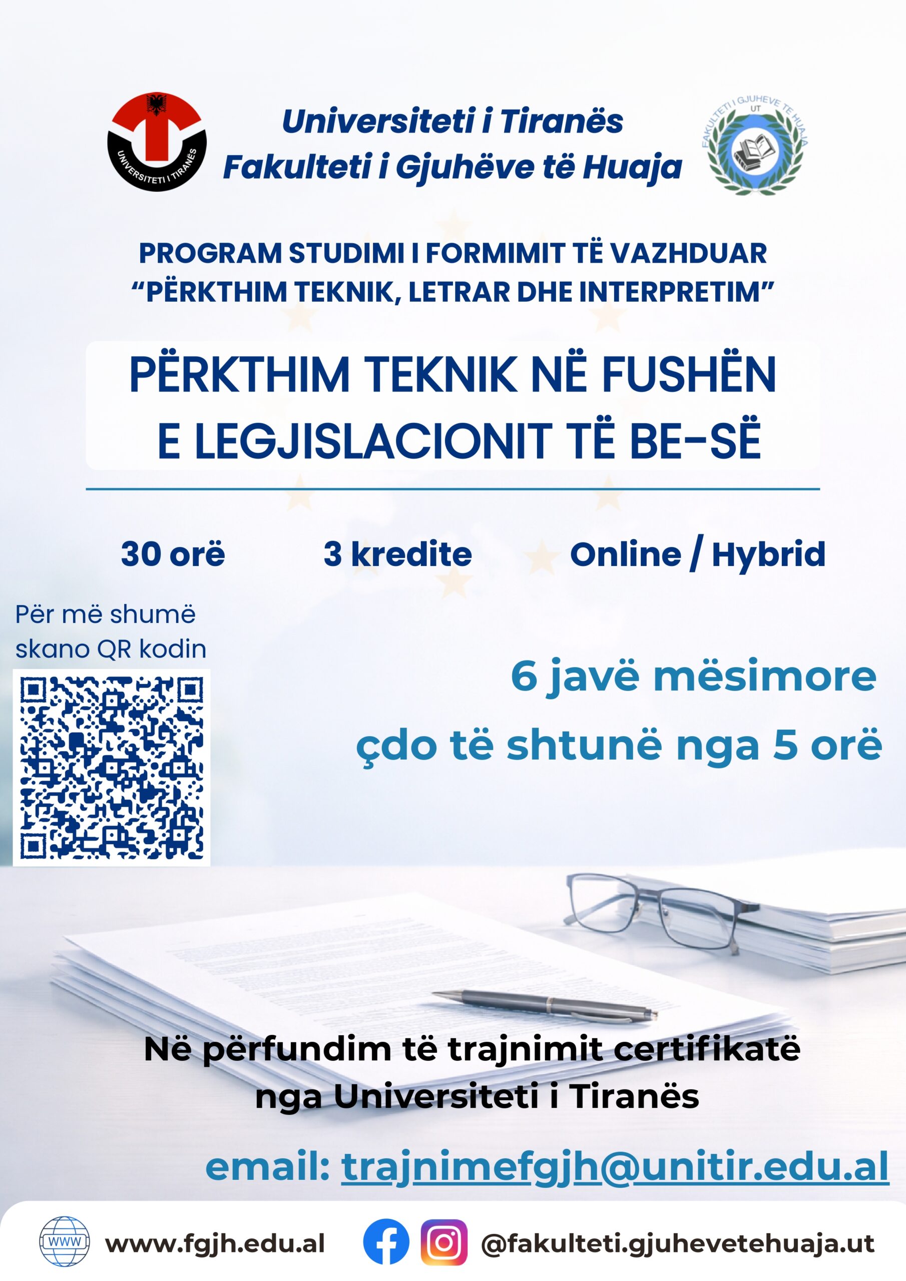 Fakulteti i Gjuhëve të Huaja i Universitetit të Tiranës, hap aplikimet për modulin e formimit të vazhduar në Fushën e Përkthimit Teknik, Letrar dhe Interpretim: 🔹 Përkthim teknik në fushën e legjislacionit të BE-së 🗓 Aplikimet: 1 – 15 Prill 2026 📢 Shpallja e fituesve: 25 Prill 2026 📚 Kohëzgjatja: 30 orë (5 javë), çdo të...Lexo më shumë