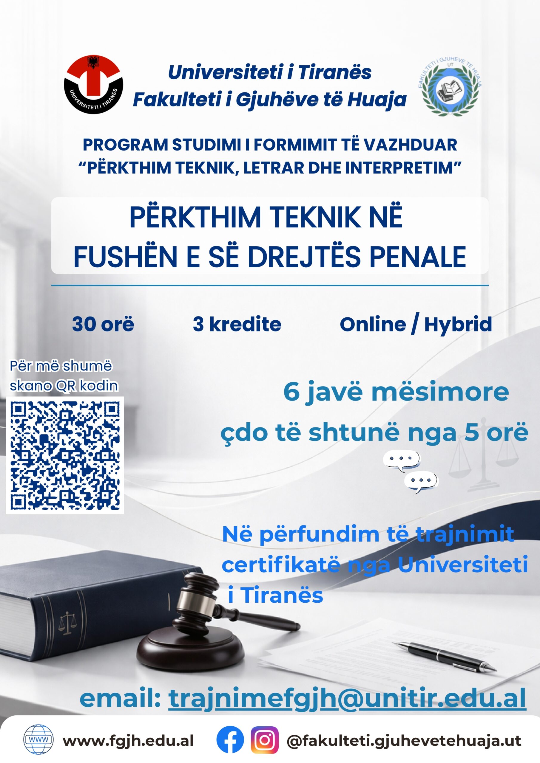 Fakulteti i Gjuhëve të Huaja i Universitetit të Tiranës, hap aplikimet për modulin e formimit të vazhduar në Fushën e Përkthimit Teknik, Letrar dhe Interpretim: 🔹 Përkthim teknik në fushën e së drejtës penale 🗓 Aplikimet: 1 – 15 Prill 2026 📢 Shpallja e fituesve: 25 Prill 2026 📚 Kohëzgjatja: 30 orë (5 javë), çdo të...Lexo më shumë