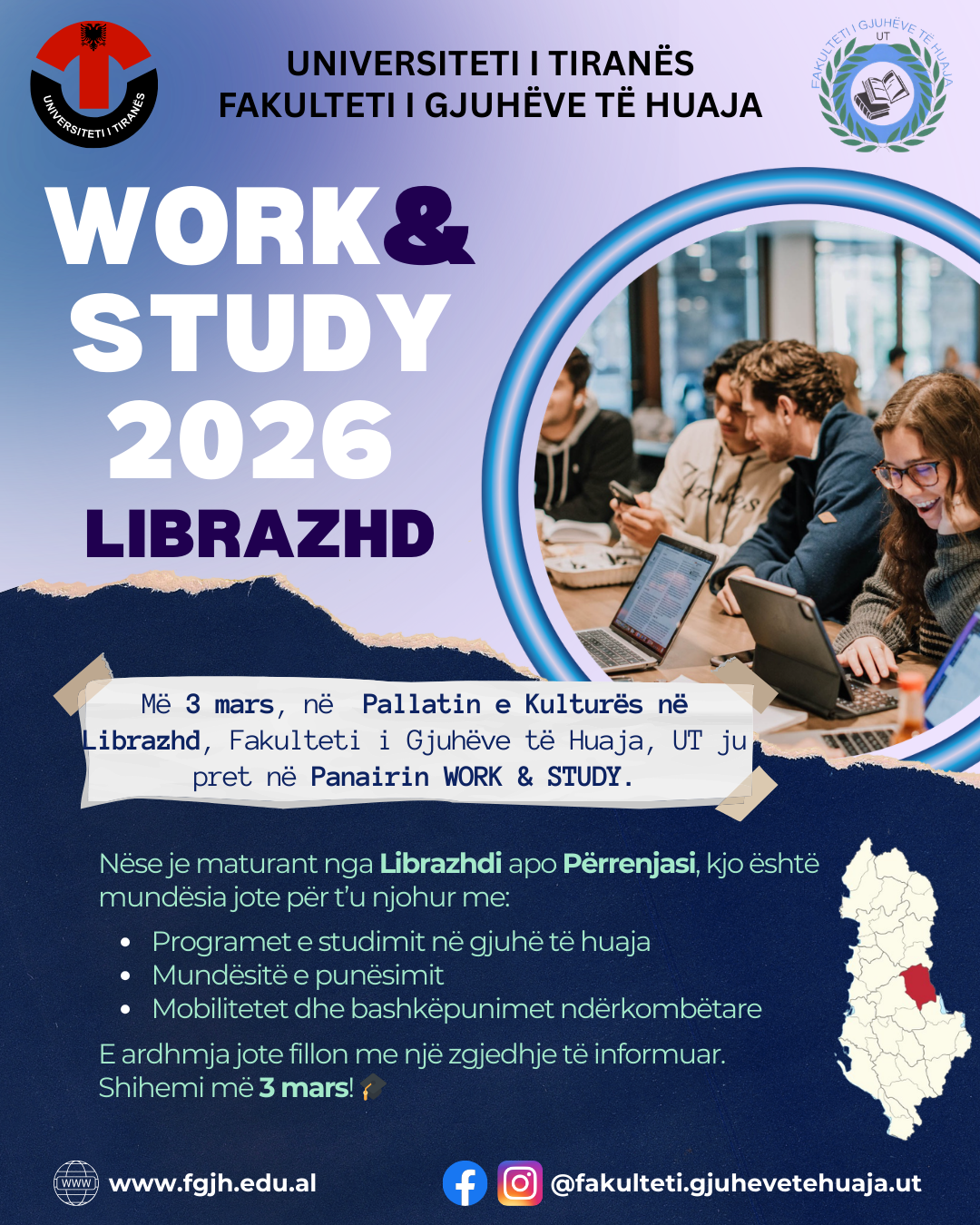 Më 27 shkurt, në Pallatin e Sportit në Durrës, Fakulteti i Gjuhëve të Huaja, UT ju pret në Panairin WORK & STUDY. Nëse je maturant nga Durrësi apo Shijaku, kjo është mundësia jote për t’u njohur me: ✔️ Programet e studimit në gjuhë të huaja ✔️ Mundësitë e punësimit ✔️ Mobilitetet dhe bashkëpunimet ndërkombëtare E...