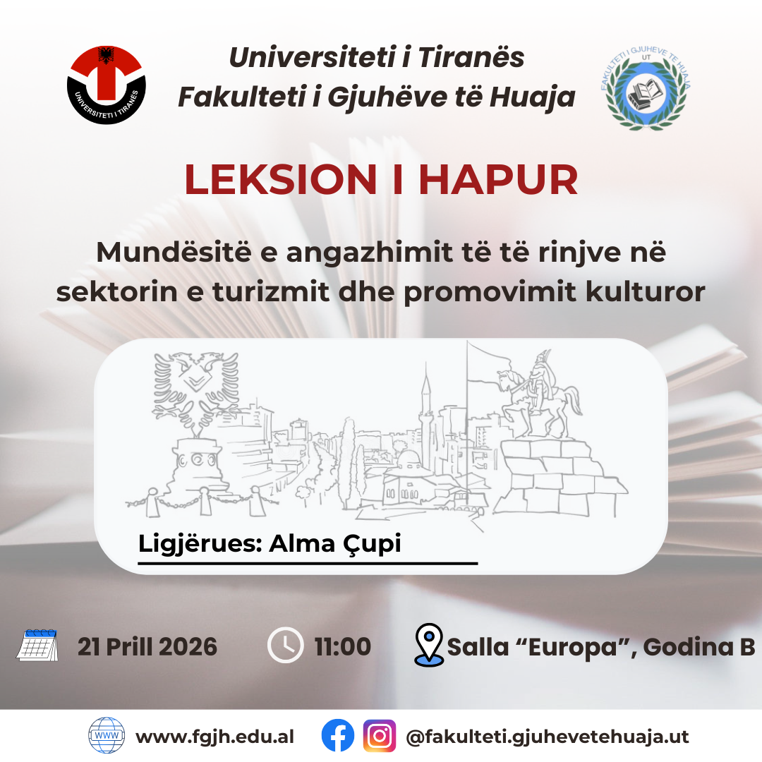 Fakulteti i Gjuhëve të Huaja, Universiteti i Tiranës, ka kënaqësinë të ftojë studentët, pedagogët dhe të gjithë të interesuarit në një leksion të hapur me temë: “Mundësitë e angazhimit të të rinjve në sektorin e turizmit dhe promovimit kulturor” 👩‍🏫 Leksioni do të mbahet nga Alma Çupi, një figurë e njohur në fushën e turizmit...
