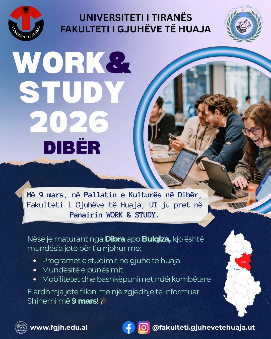 Më 9 mars, në Pallatin e Kulturës në Dibër, Fakulteti i Gjuhëve të Huaja, UT ju pret në Panairin WORK & STUDY. Nëse je maturant nga Dibra apo Bulqiza, kjo është mundësia jote për t’u njohur me: ✔️ Programet e studimit në gjuhë të huaja ✔️ Mundësitë e punësimit ✔️ Mobilitetet dhe bashkëpunimet ndërkombëtare E...