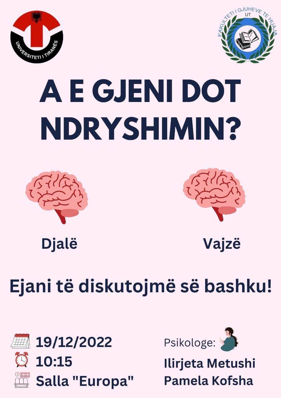 Diskutim i hapur me studentët: Le të flasim për bullizmin Data: 19 Mars Ora: 11:00 Qendra Multifunskionale, Fakulteti i Gjuhëve të Huaja Zyra e Psikologut në Fakultetin e Gjuhëve të Huaja organizon një diskutim të hapur me studentët për të folur rreth bullizmit, një fenomen që prek shumë të rinj dhe ka ndikim të madh...