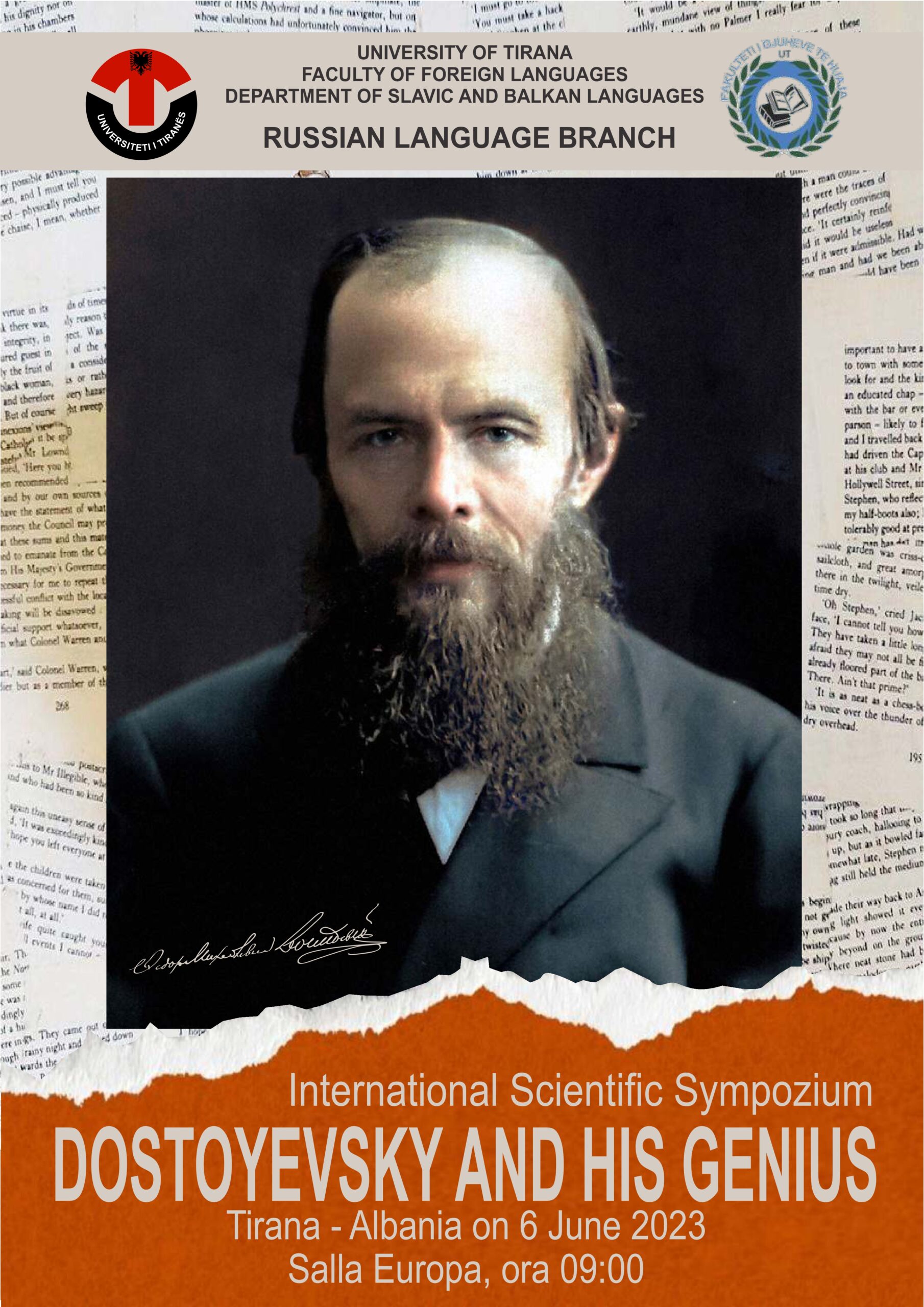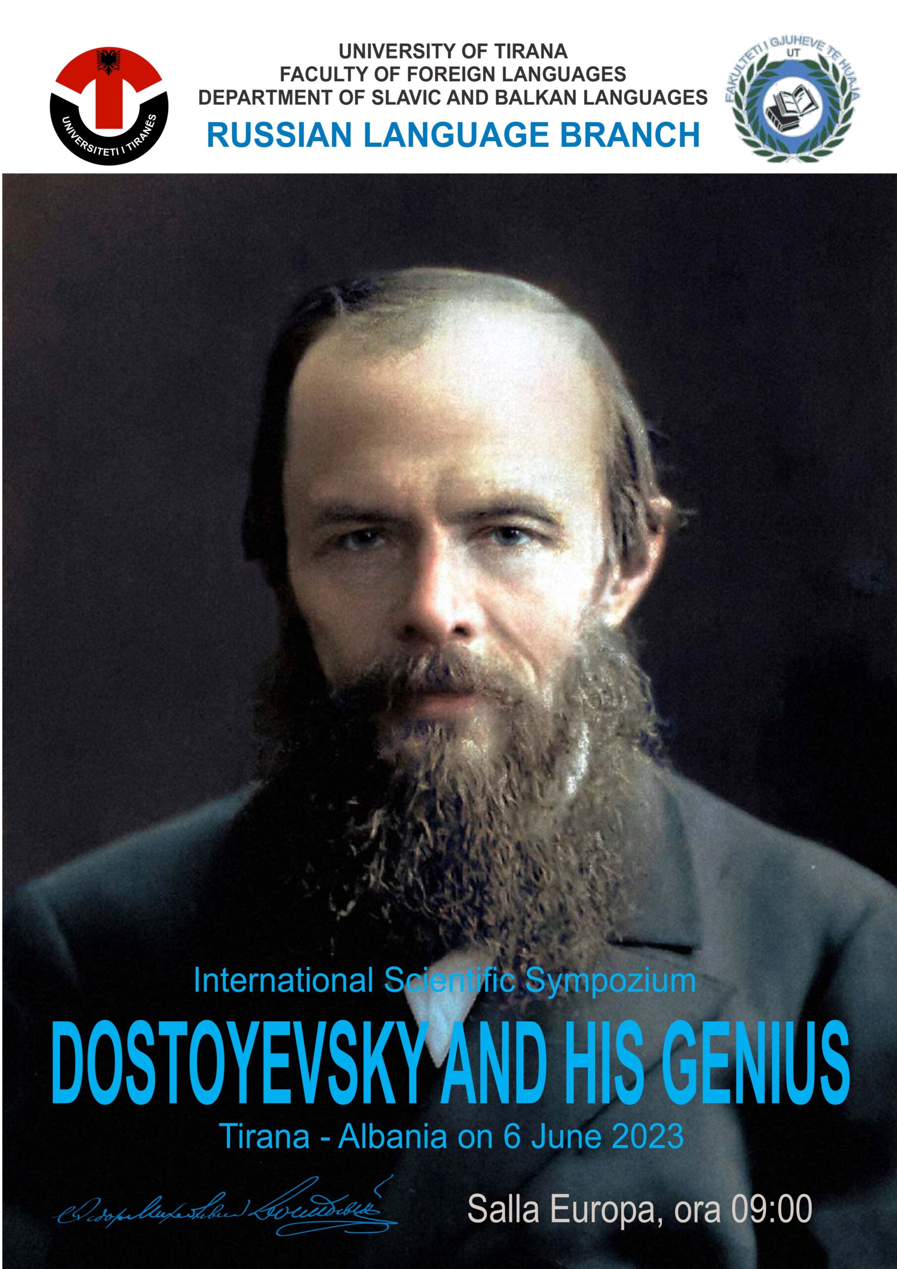 Ftojmë të gjithë studiuesit, pedagogët, doktorantët, studentët pasuniversitarë, përkthyesit dhe të interesuarit, të marrin pjesë në Simpoziumin Shkencor Ndërkombëtar me temë: «DOSTOJEVSKI DHE GJENIALITETI I TIJ», i cili do tëorganizohet më 06 Qershor 2023.
