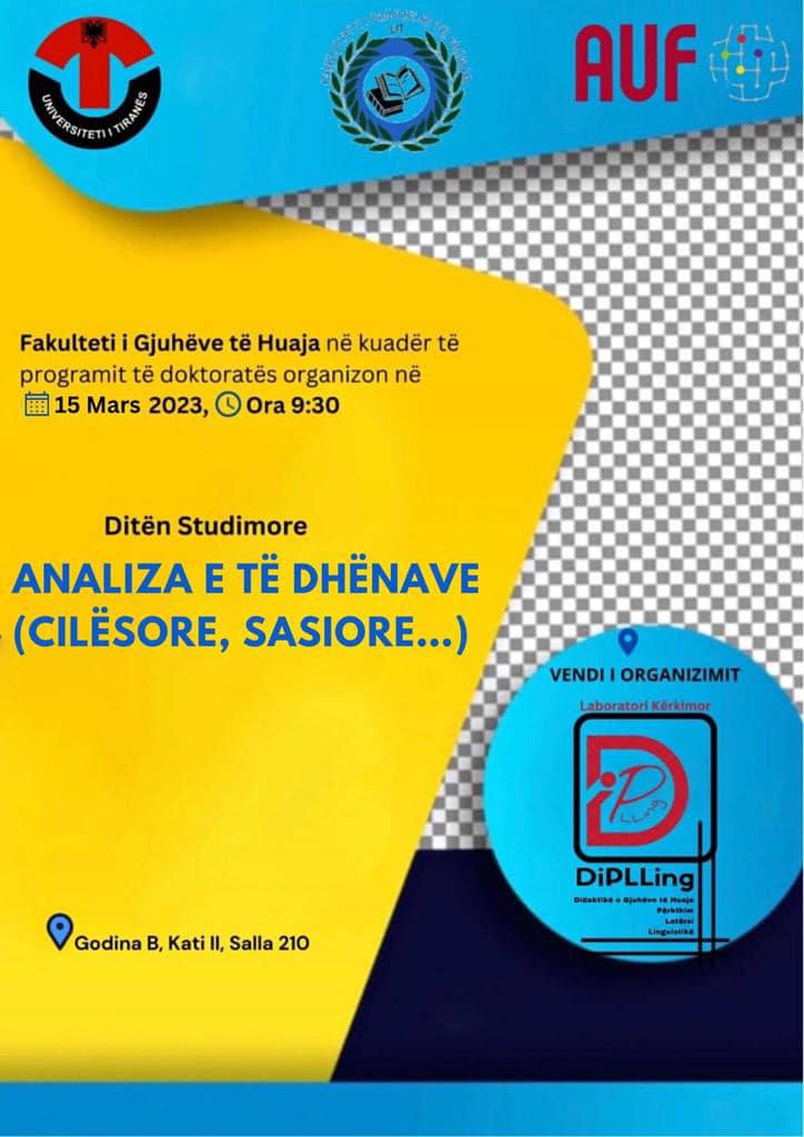 Vijuam me datë 15.03.2023 , ditën e tretë studimore me doktorantët e FGJH-së, me temë “Analiza e të dhënave shkencore cilësore e sasiore”nën drejtimin e Prof. Dr. Eldina Nasufi. Aktiviteti shkencor, i zhvilluar në Laboratorin Kërkimor “Didaktika e Gjuhëve të Huaja, Përkthim, Letërsi, Linguistikë” – DiPLLing, FGJH, synon mbështetjen dhe përkrahjen për një formim sa më të mirë shkencor të studiuesve të rinj doktorantë në FGJH.
