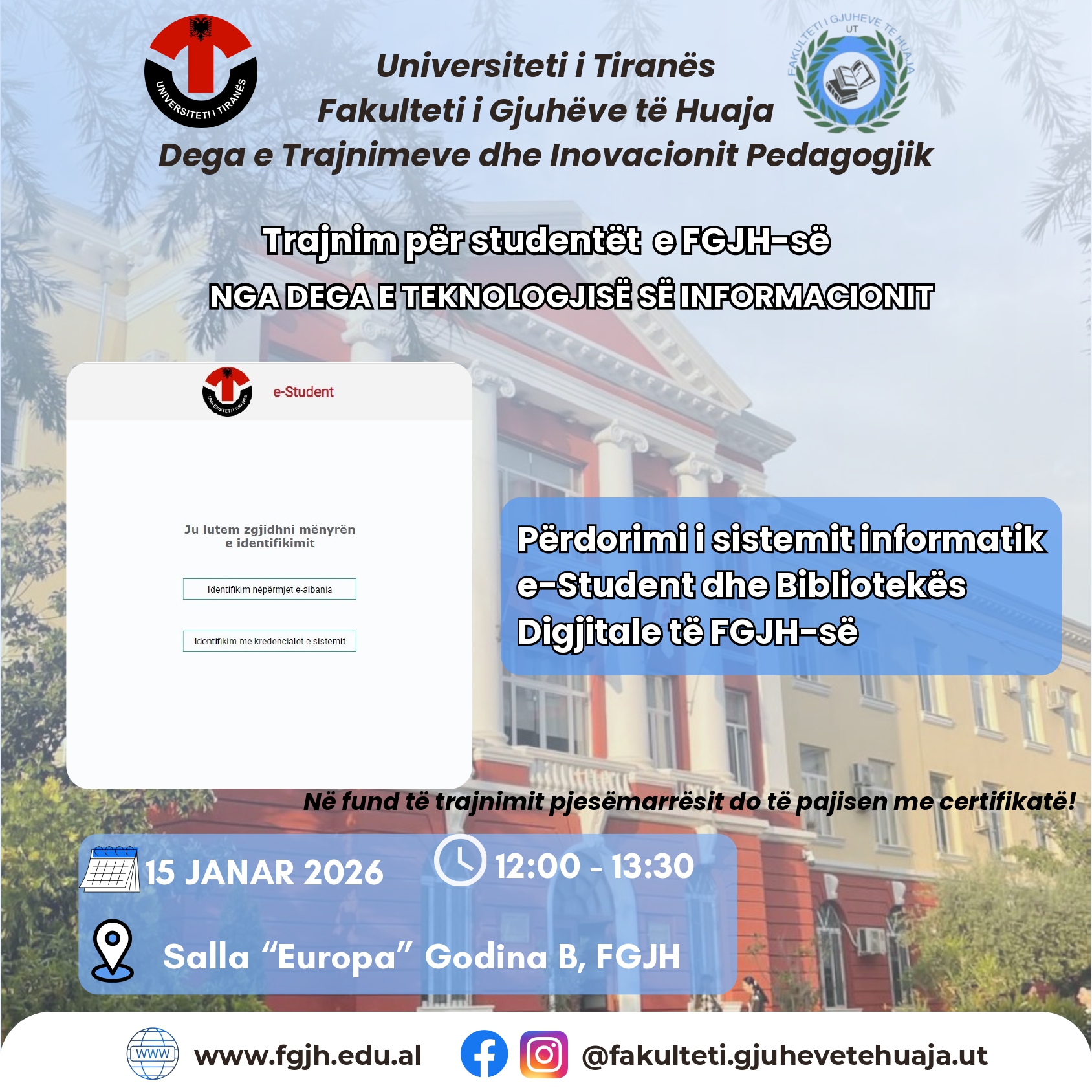 🏫Dega e Trajnimeve dhe Inovacionit Pedagogjik, në bashkëpunim me Degën e Teknologjisë së Informacionit në FGJH, fton studentët të marrin pjesë në trajnimin me temë: 💻‘‘Përdorimi i Sistemit informatik e-Student. Shfrytëzimi i burimeve të literaturës nga Biblioteka Digjitale e FGJH’’. 📆Data: 15 janar 2026 ⏱️Ora: 12:00 – 13:30 📍Vendi: Salla “Europa”, Godina B, Fakulteti i...