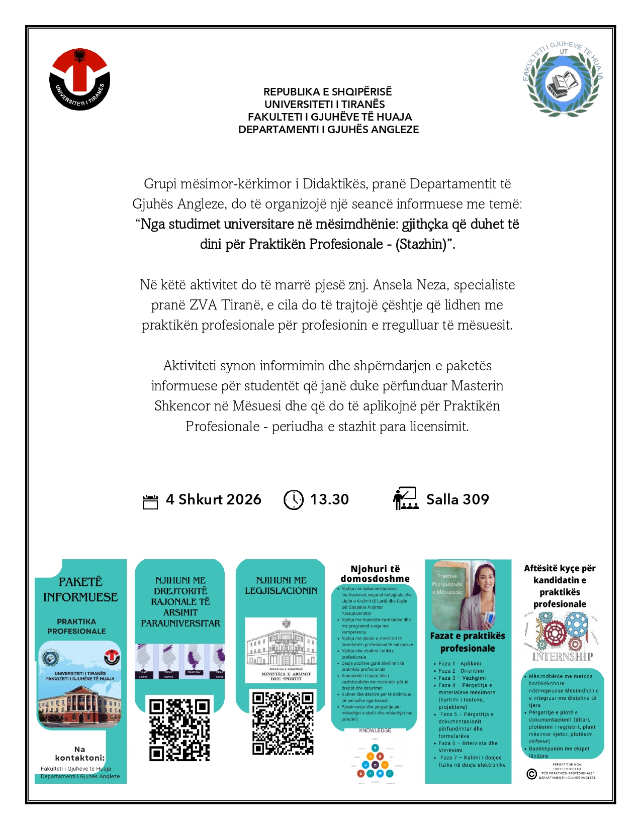 Aktiviteti synon informimin dhe shpërndarjen e paketës informuese për studentët që janë duke përfunduar Masterin Shkencor në Mësuesi dhe që do të aplikojnë për Praktikën Profesionale – periudha e stazhit para licensimit. Aktiviteti do të zhvillohet më datë 4 Shkurt 2026, në orën 13:30, në sallën 309.