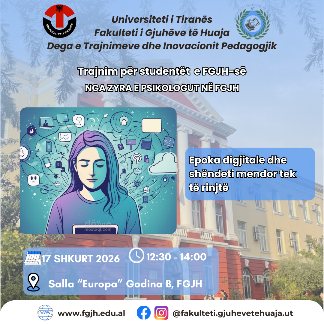 Dega e Trajnimeve dhe Inovacionit Pedagogjik, në bashkëpunim me Zyrën e Psikologut në FGJH, fton studentët të marrin pjesë në trajnimin me temë: ‘‘Epoka digjitale dhe shëndeti mendor tek të rinjtë’’. 📆Data: 17 shkurt 2026 ⏱️Ora: 12:30 – 14:00 📍Vendi: Salla “Europa”, Godina B, Fakulteti i Gjuhëve të Huaja.