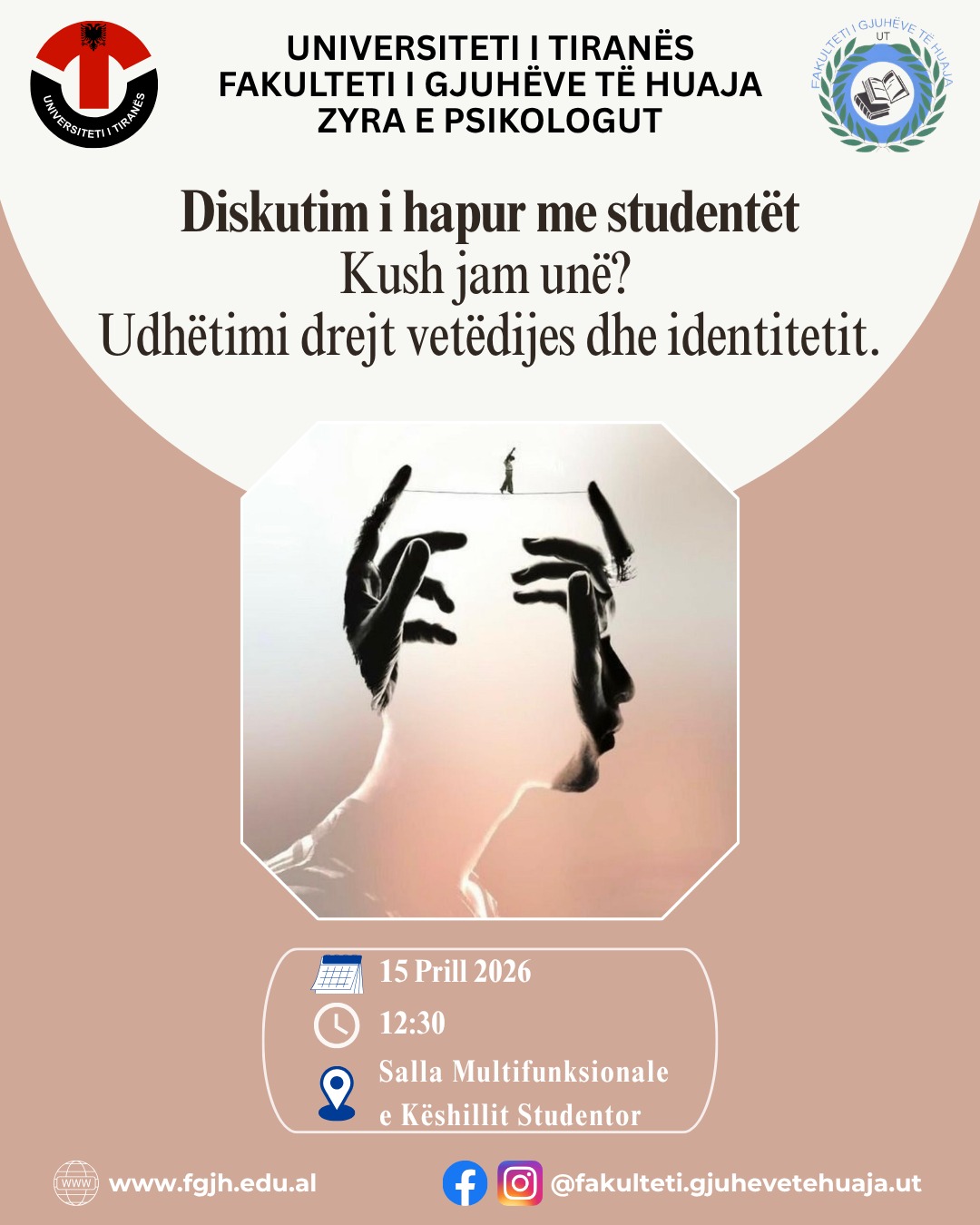 Zyra e Psikologut, në Fakultetin e Gjuhëve të Huaja, UT, në bashkëpunim me Klubin studentor të Artit KS-FGJH, organizon diskutimin e hapur me temë: “Kush jam unë? Udhëtimi drejt vetëdijes dhe identitetit.” Ky aktivitet synon të krijojë një hapësirë reflektimi dhe bashkëbisedimi mbi njohjen e vetes, identitetin dhe shëndetin mendor. Në kuadër të këtij organizimi,...