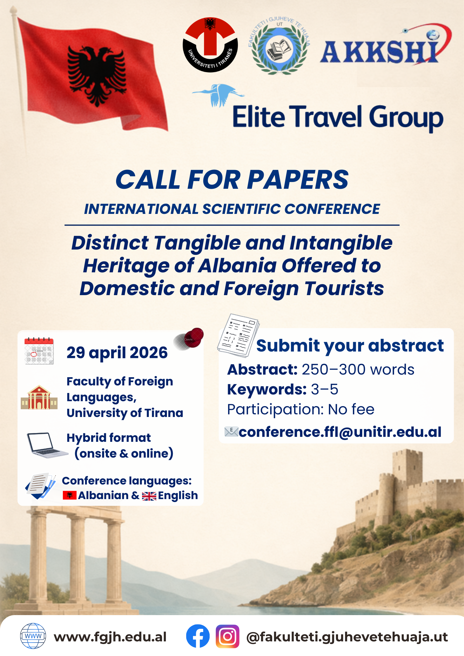 The conference is organized within the framework of a research project on the development of sustainable tourism and multilingual digital marketing through the Albania 365 platform. It aims to foster interdisciplinary analyses on the identification, preservation, management, and promotion of Albania’s tangible and intangible heritage as part of the country’s tourism offer.