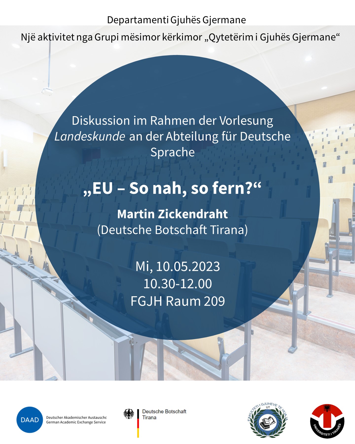 Në kuadër të aktiviteteve të grupit mësimor kërkimor “Qytetërim i Gjuhës Gjermane” ditën e mërkurë, datë 10.05.2023, nga ora 10.30 deri në orën 12.00, në sallën 209, do të mbahet një takim i hapur nga Z. Martin Zickendraht, Atashe Kulturor i Ambasadës Gjermane në Shqipëri.