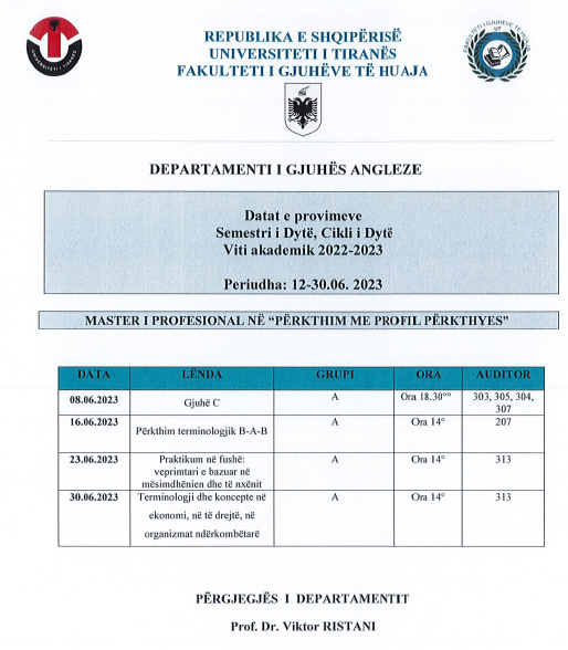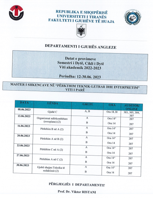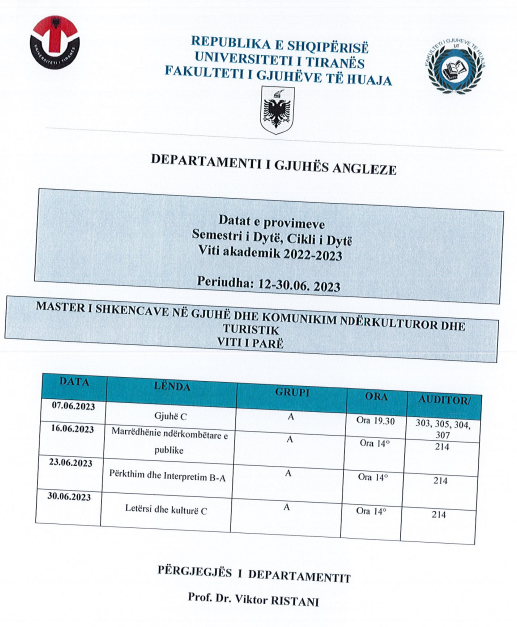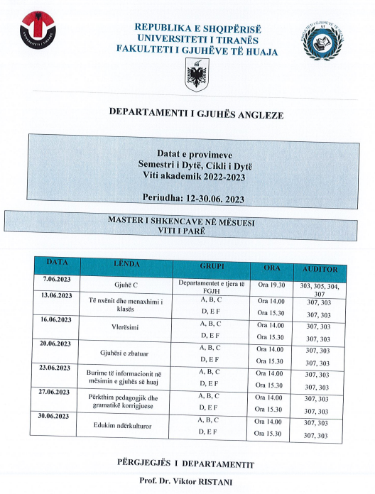 Njoftim! Ju përcjellim Grafikët e provimeve për programet Master, Viti I, Gjuhë Angleze, Sezoni i Verës 2023, Viti Akademik 2022-2023. Suksese!