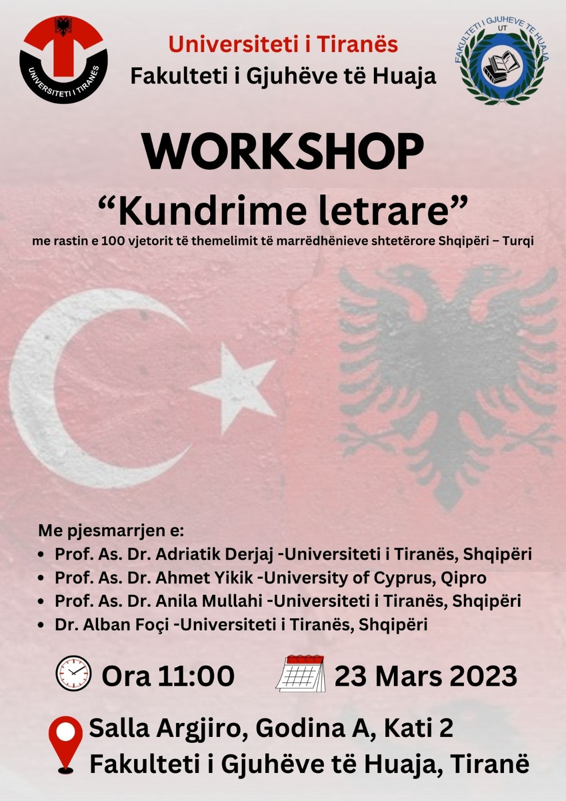 Nē sallën Argjiro të Fakultetit tonë, u mbajt një workshop me temë “Kundrime Letrare” me rastin e 100 vjetorit të vendosjes së marrëdhënieve zyrtare Shqipëri-Turqi.
