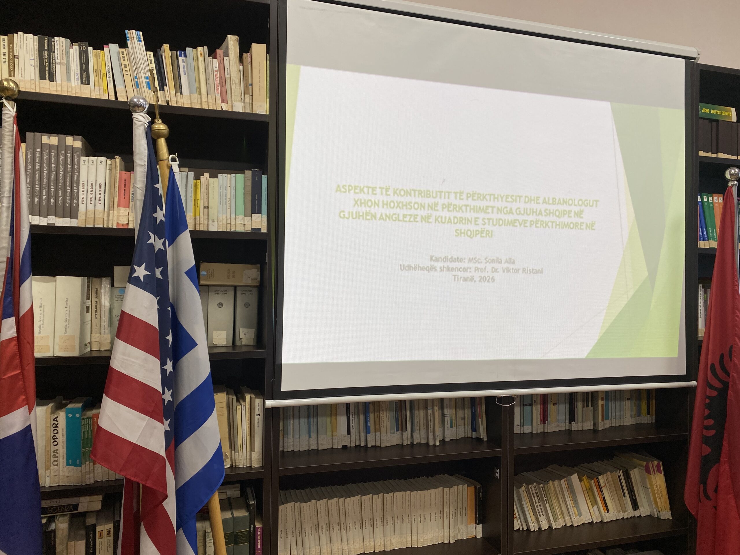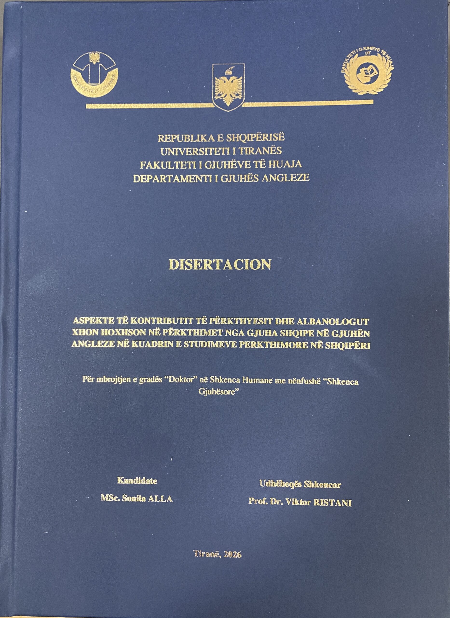 Sot, në Fakultetin e Gjuhëve të Huaja, UT, studentja doktorante e Departamentit të Gjuhës angleze, Znj. Sonila Alla, mbrojti me sukses disertacionin e saj për gradën shkencore “Doktor” me temë “Aspekte të kontributit të përkthyesit dhe albanologut Xhon Hoxhson në përkthimet nga gjuha shqipe në gjuhën angleze në kuadrin e studimeve përkthimore në Shqipëri”, nën udhëheqjen shkencore të Prof. Dr. Viktor Ristani.