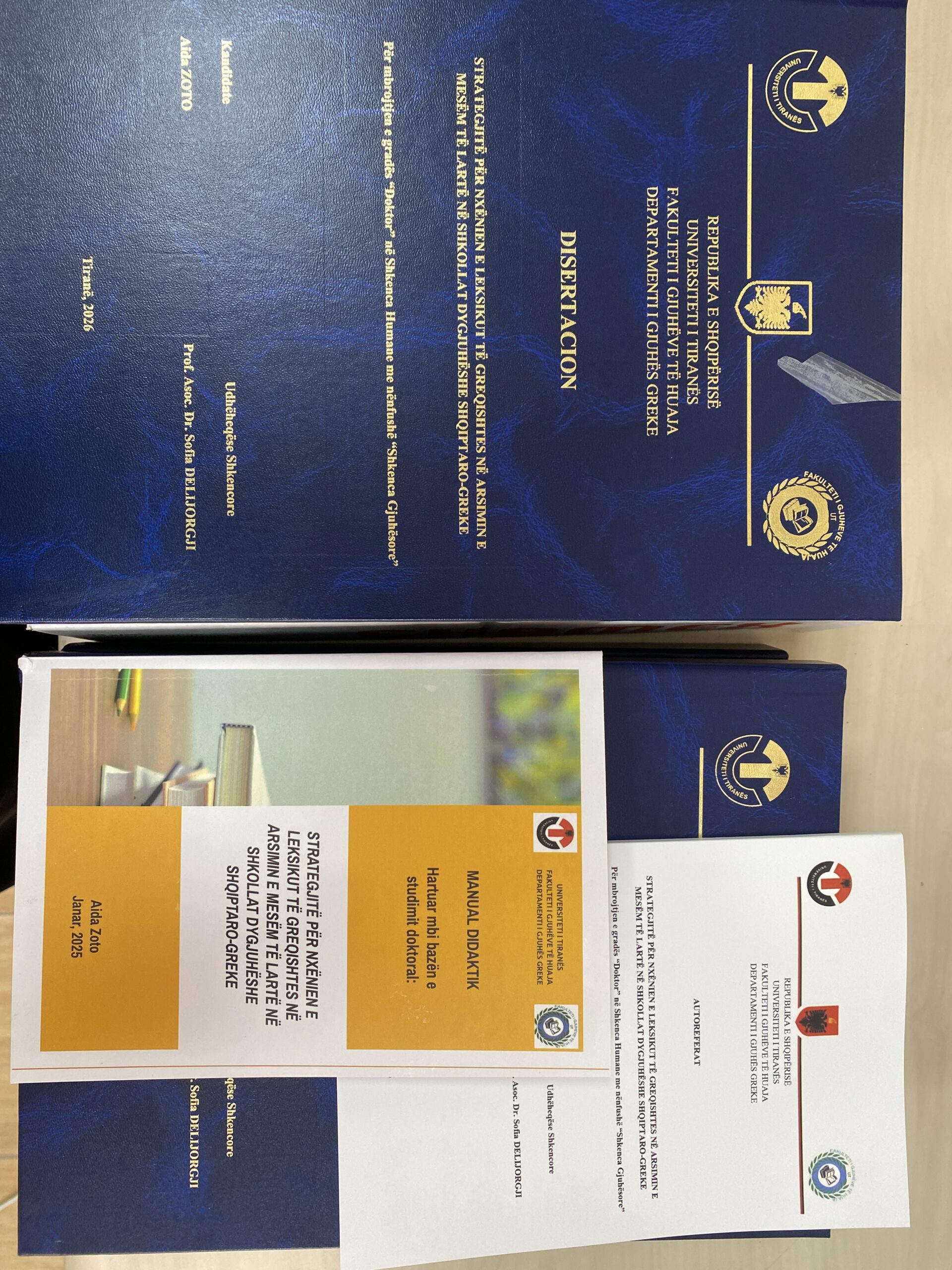 Sot, në Fakultetit të Gjuhëve të Huaja, UT, studentja doktorante e departamentit të gjuhës greke Znj. Aida Zoto, mbrojti me sukses disertacionin e saj për gradën “Doktor” me temë “Strategjitë për nxënien e leksikut të greqishtes në arsimin e mesëm të lartë në shkollat dygjuhëshe shqiptaro-greke”, nën udhëheqjen shkencore të Prof. Asoc. Dr. Sofia Delijorgji.
