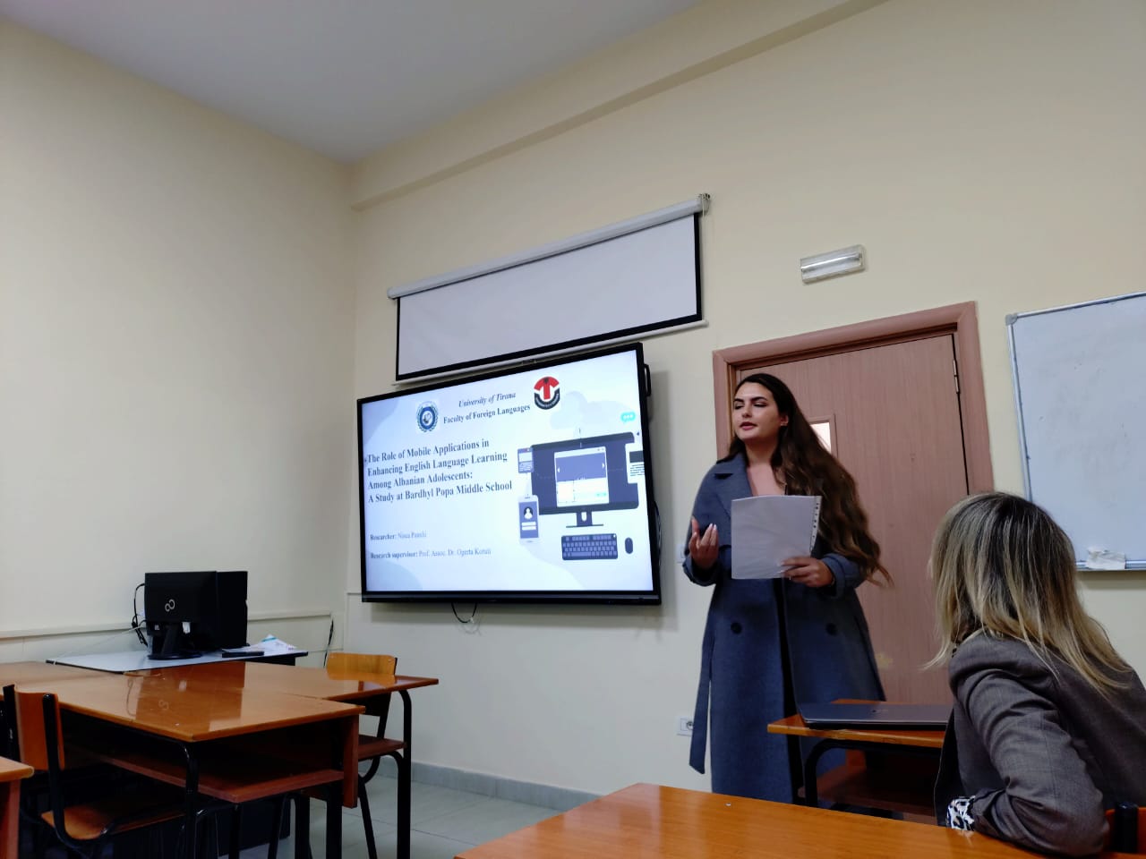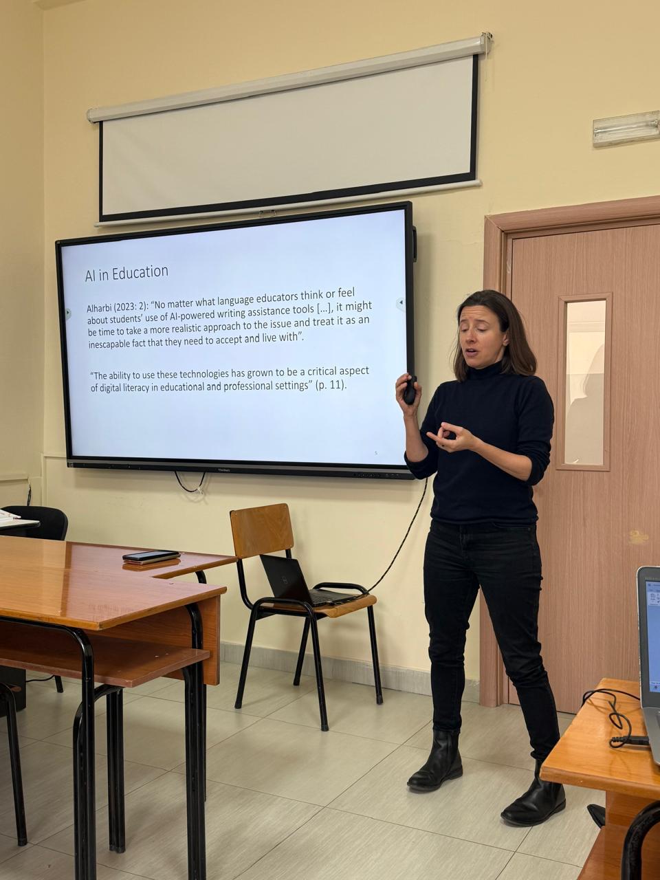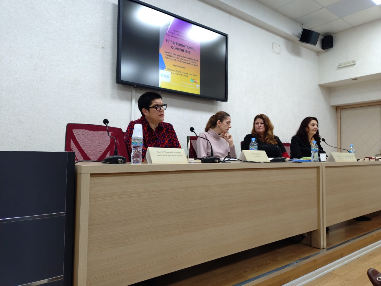 Prof. Asoc. Dr. Daniela Hasa në cilësinë e Përgjegjësit të Departamentit hapi konferencën dhe theksoi rëndësinë e organizimit të kësaj konference, rezultatet e të cilës lidhen drejtpërdrejt me cilësinë e mësimdhënies. Konferenca u përshëndet nga Prof. Dr. Esmeralda Kromidha, Dekane e Fakultetit të Gjuhëve të Huaja, e cila nënvizoi rëndësinë e përfshirjes së elementeve të teknologjisë, veçanërisht rolin që Inteligjenca Artificiale po luan në çdo fushë të jetës. Ajo theksoi që risitë në kërkimin shkencor duhet të jenë në fokus të aktiviteteve të tilla dhe të përfshihen në programet e studimit, me qëllim që FGJH-ja të jetë sa më pranë risive dhe prurjeve më të fundit të shkencave gjuhësore. Kjo konferencë u përshëndet edhe nga Tatjana Slijepcevic, drejtuese e programit English Connects për Europën, nga Këshilli Britanik e cila prezantoi dhe bashkëpunimin e ri që është ngritur midis Këshillit Britanik dhe Departamentit të Gjuhës Angleze për përfshirjen e studentëve të ciklit të dytë Master i Shkencave në Mësuesi e Gjuhës Angleze për Arsimin e Mesëm të Lartë në platformën ndërvepruese për zhvillimin profesional “Online Teacher Community”. Cristiana Osan, trajnere e certifikuar DELTA, pjesë e programeve të formimit të vazhduar të ofruara nga Këshilli Britanik, prezantoi platformën ku janë të përfshirë studentët e Departamentit të Gjuhës Angleze duke përgëzuar angazhimin e tyre maksimal.