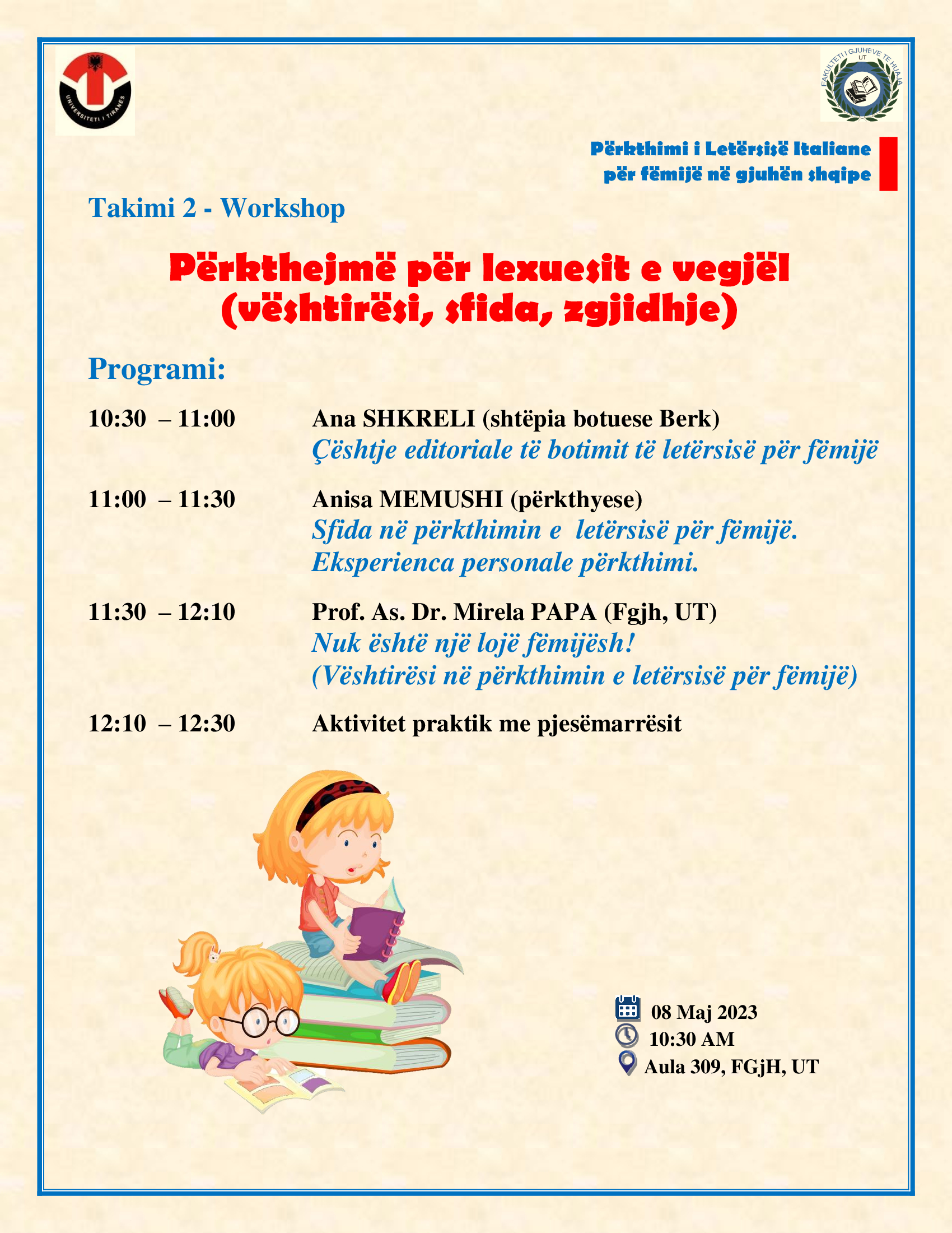 Ditën e hënë, datë 08 maj 2023, ora 10:30, në kuadër të projektit shkencor «Përkthimi i letërsisë italiane për fëmijë në gjuhën shqipe», grupi kërkimor-mësimor i Përkthimit & Interpretimit i Departamentit të Gjuhës Italiane, organizon Workshop-in me titull «Përkthejmë për lexuesit e vegjël (vështirësi, sfida, zgjidhje)». Grupi i synuar i trajnimit janë studentët e vitit të tretë Bachelor, studentët e Masterit të Shkencave në Përkthim tekniko-letrar dhe Interpretim, si edhe studentët doktorantë të fushës Gjuhësi-Përkthim të Departamentit.