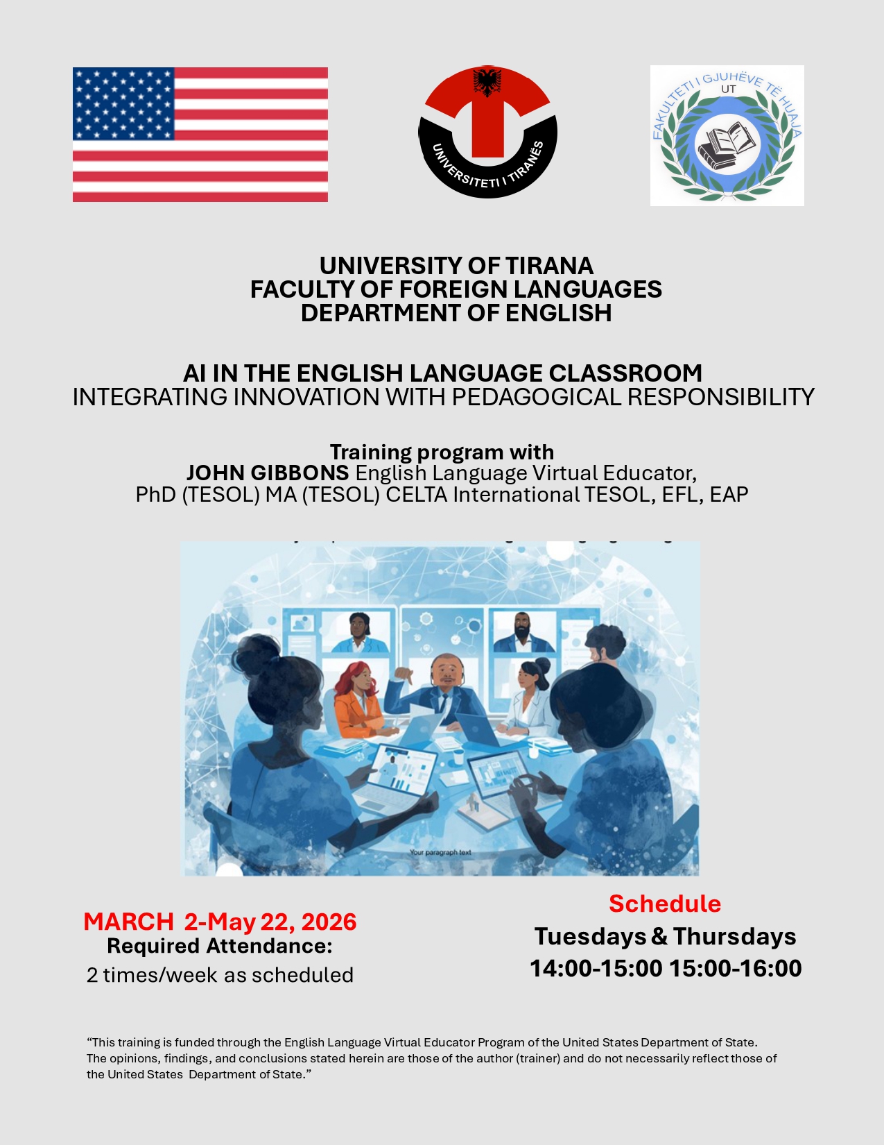 Departamenti i Gjuhës Angleze, Fakulteti i Gjuhëve të Huaja, Universiteti i Tiranës, do të zhvillojë seanca trajnimesh lidhur me përdorimin e Inteligjencës Artificiale në mësimdhënie