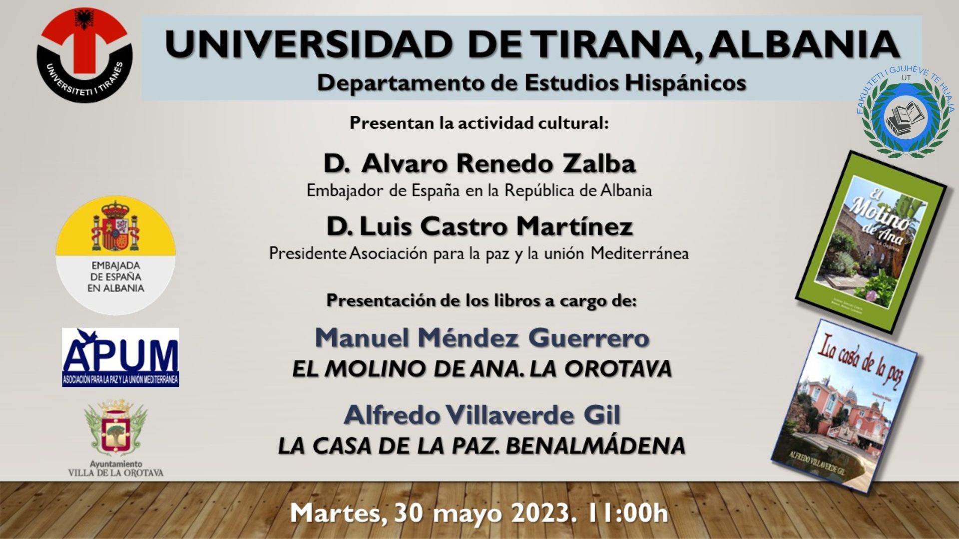 Departamenti i Gjuhës Spanjolle ka kënaqësinë t’ju ftojë nesër në datë 30.05.2023 në takimin që do të zhvillohet në bashkëpunim me Ambasadën Spanjolle me dy shkrimtarët spanjollë Alfredo Villaverde Gil dhe Manuel Méndez Guerrero.