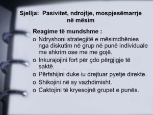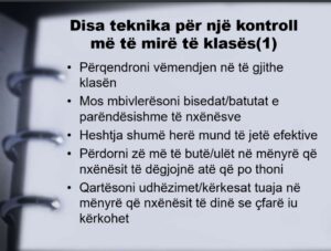 Pjesëmarrësit në këtë trajnim u informuan mbi strategjitë pozitive dhe proaktive për krijimin e një mjedisi mësimor efektiv si dhe mbi përdorimin e një sërë strategjish për t’iu përgjigjur më së miri nevojave të procesit mësimor.