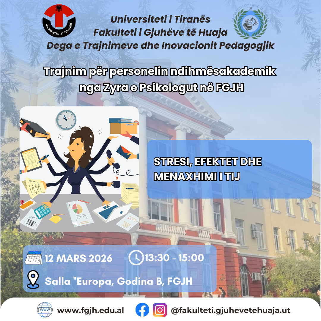 Në kuadër të zhvillimit të vazhdueshëm të personelit ndihmës akademik, Dega e Trajnimeve dhe Inovacionit Pedagogjik në bashkëpunim me Zyrën e Psikologut në FGJH, organizon trajnimin me temë: ‘‘Stresi: efektet dhe menaxhimi i tij’’.