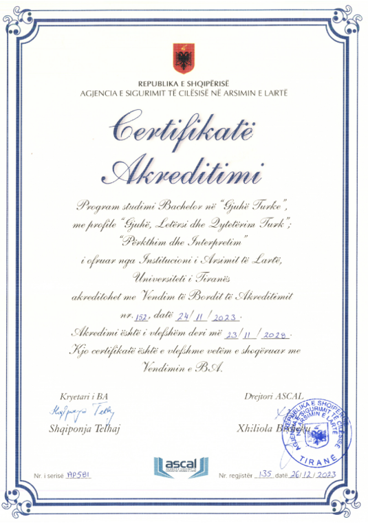 Fakulteti i Gjuhëve të Huaja ka kaluar me sukses procesin e vlerësimit të brendshëm të cilësisë në kuadër të akreditimit të programeve Bachelor në të gjitha profilet që ai ofron, në programin Master i Shkencave në Përkthim Teknik – Letrar, Master i Shkencave në Mësuesi e Gjuhës Turke për arsimin e mesëm të lartë, në përputhje me ligjin dhe aktet nënligjore në fuqi.