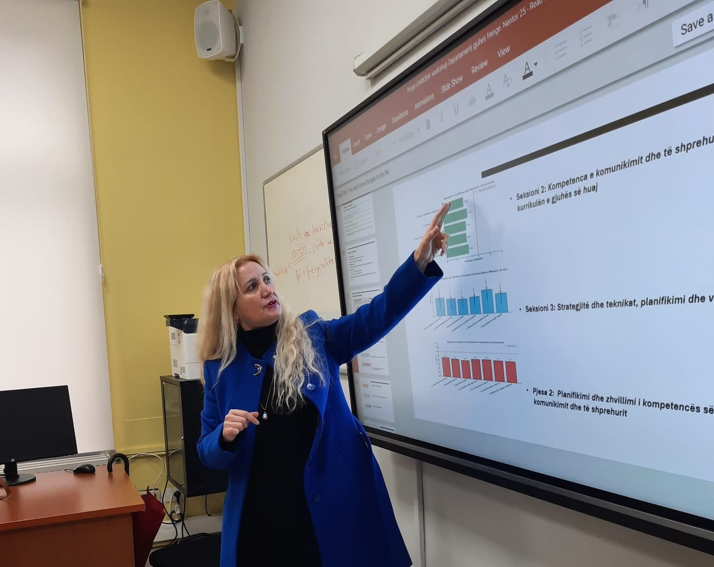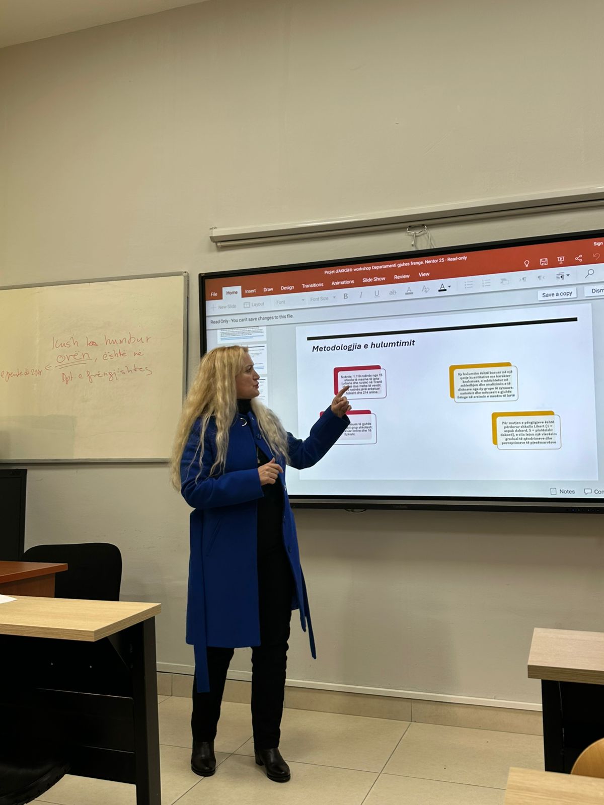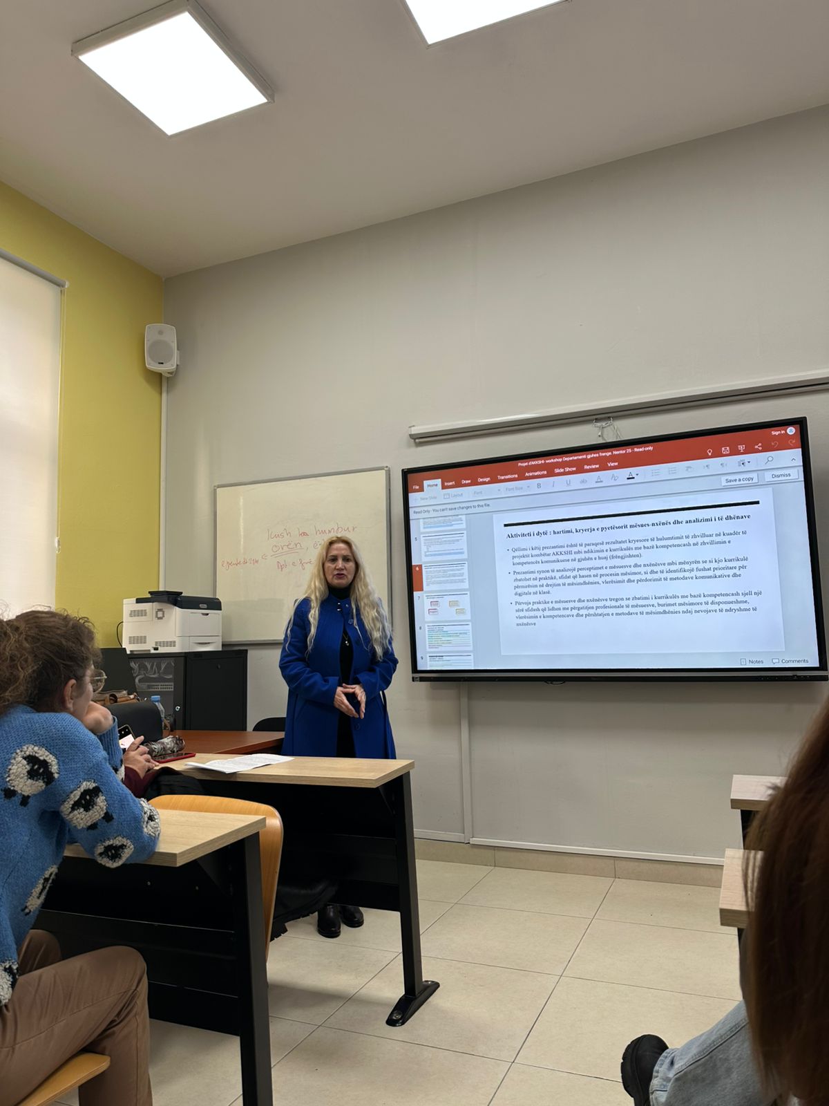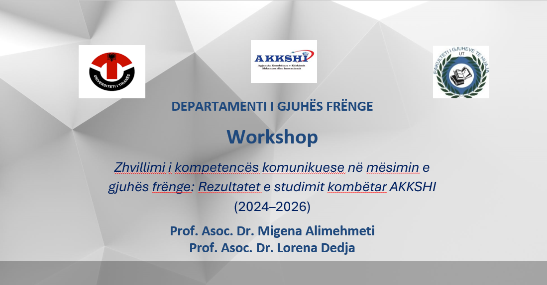 Më datë 21 nëntor 2025, Departamenti i Gjuhës Frënge organizoi workshop me studentët e ciklit Master në kuadër të projektit kërkimor kombëtar AKKSHI (2024–2026): «Ndikimi i kurrikulës ‘Mësimdhënie me bazë kompetencash’ në zhvillimin e kompetencës komunikuese të nxënësve të gjuhëve të huaja në arsimin e mesëm të lartë». Ky aktivitet u zhvillua nga Prof. Asoc. Dr. Migena Alimehmeti dhe Prof. Asoc. Dr. Lorena Dedja, si pjesë e workshop-eve dedikuar rezultateve të deritanishme të projektit të financuar nga AKKSHI. Workshop-i kishte për synim: